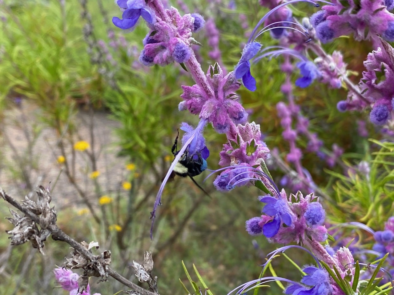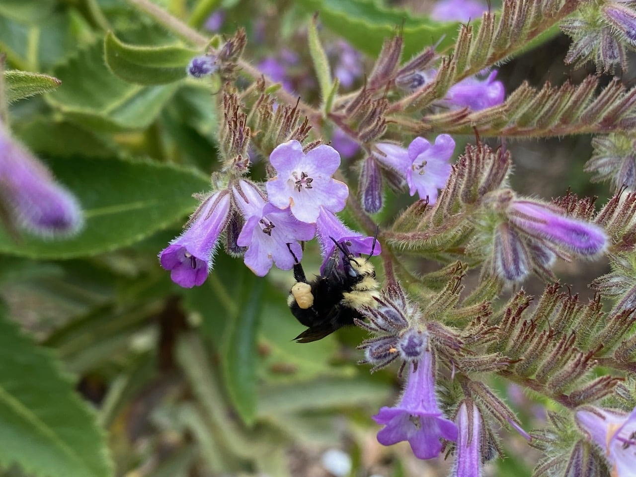 The bumble bees are also visiting the flowers of the Woolly Bluecurls, Trichostema lanatum. The bees are so heavy that they invariably make the flower droop when they land. This, however does not cause the long reproductive structures of the flowers to touch the bee. The flowers are more likely pollinated by hummingbirds that frequently visit them. While hovering in front of the flowers to take nectar, the bird’s body may come in contact with the long, curving stamens and style. Hey, what about the bright blue pollen on the bee’s corbiculae (“pollen baskets”)? Woolly Bluecurls flowers do have blue pollen, but how do the bumble bees collect it?