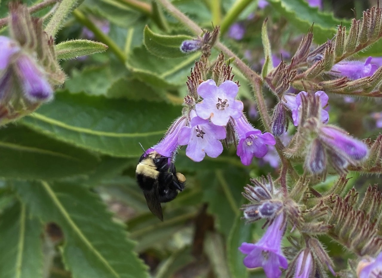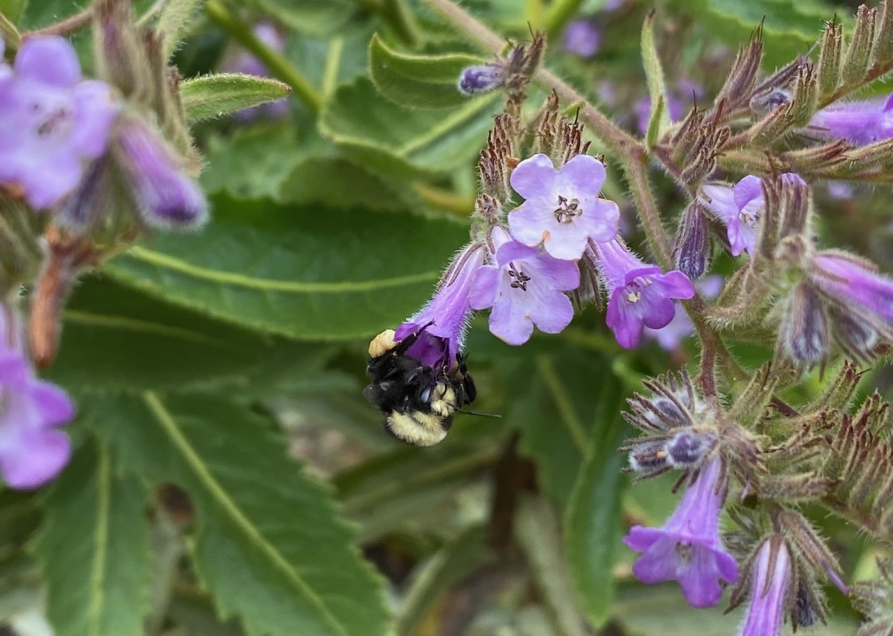 A few Yellow-faced Bumble Bees, subgenus Pyrobombus (genus Bombus, family Apidae) are foraging on the Fragrant Pitcher Sage, Lepechinia fragrans in bloom near the front gate.