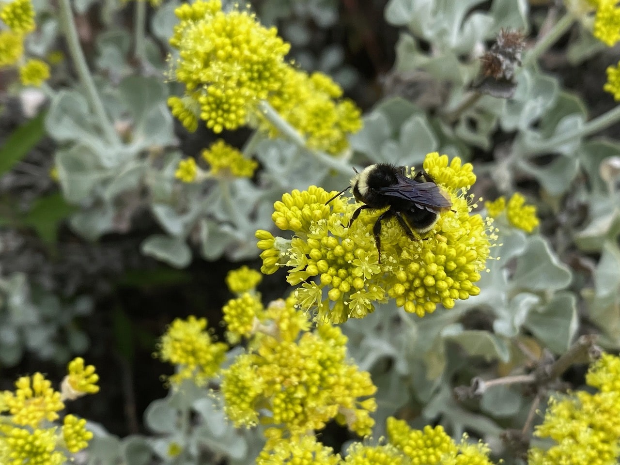 The Yerba Santa flowers are closely clustered enough that the bee does not have to fly between them.
