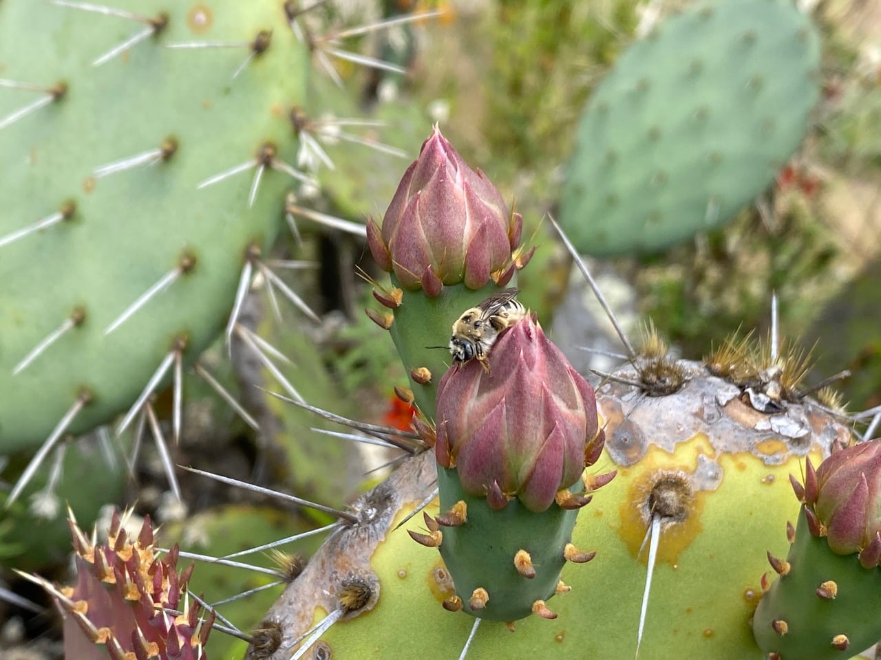 As the morning warms up, the Prickly Pear Cactus flowers, Opuntia sp. begin to open up. I glimpse a stout bee resting motionless on the green stigma in the middle of a flower. Is it still asleep?