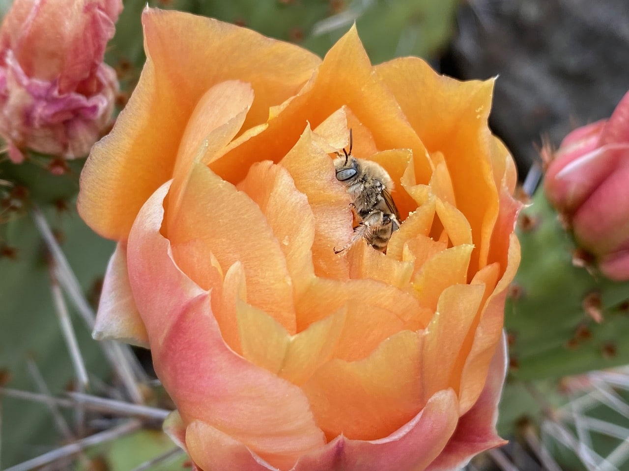 In the next patch of Opuntia, a similar bee is climbing out of an apricot-colored flower that is barely open.