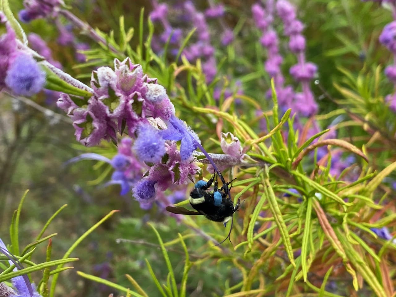 A Yellow-faced Bumble Bee is taking nectar from a Woolly Bluecurls flower.