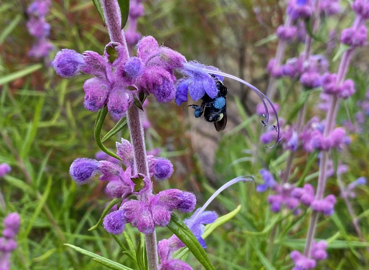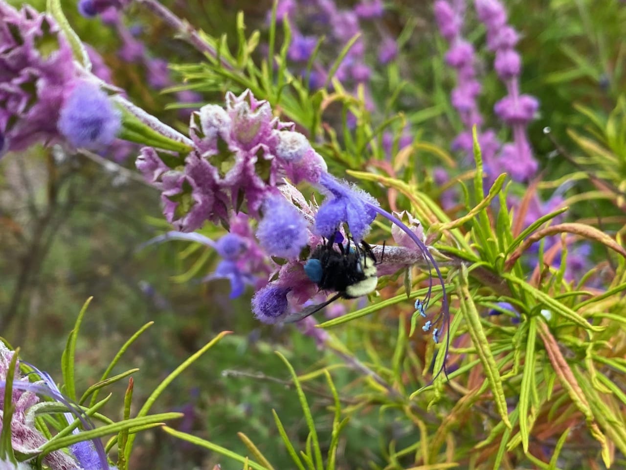 Then it grabs the long, curving stamens above it and glides down towards the anthers in one swift movement. This is the first time I have ever observed this behavior! The bumble bees do collect pollen from the Woolly Bluecurls flowers!