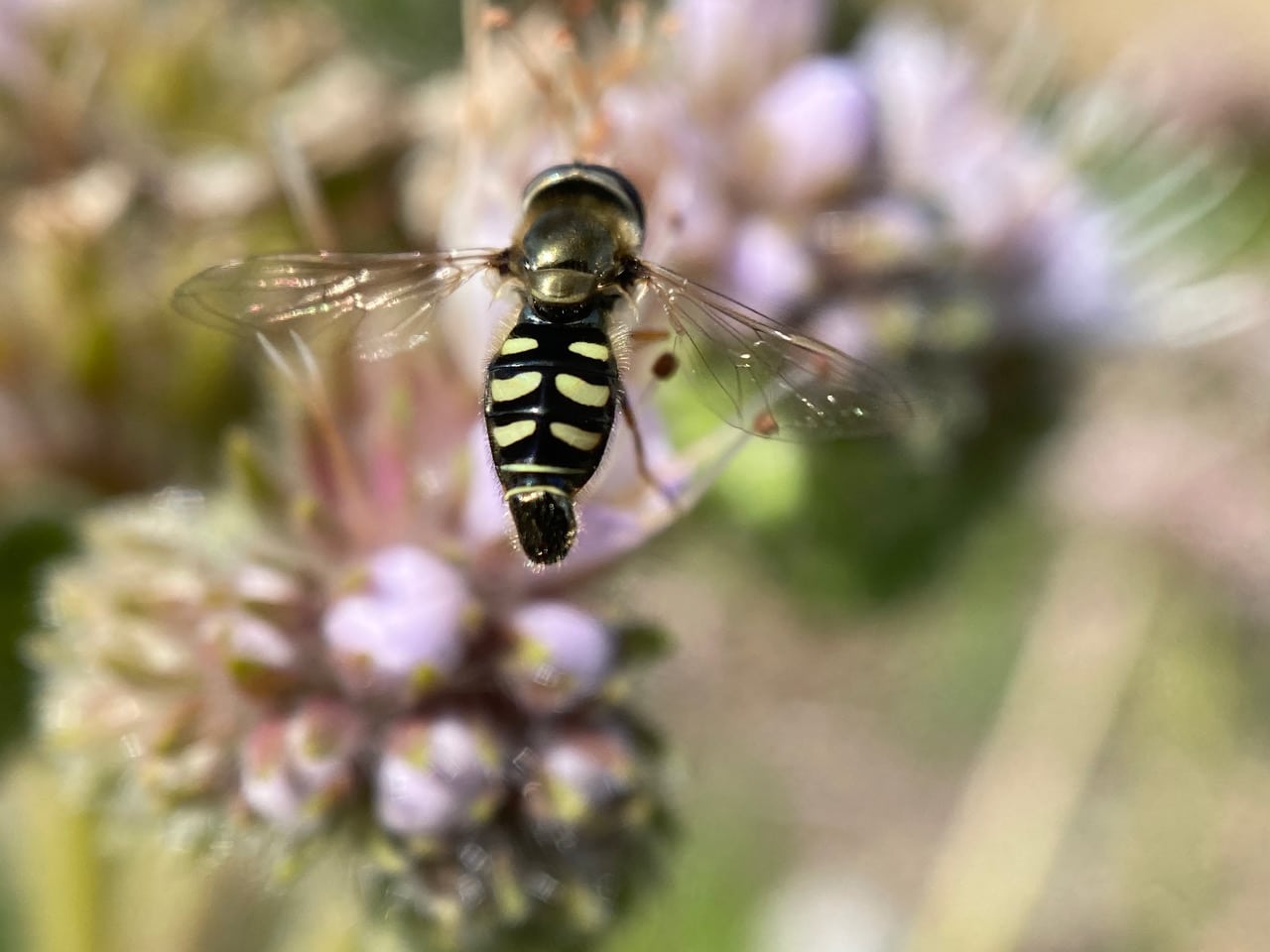 It is a female hoverfly, as evidenced by her compound eyes that do not meet on top of the head. The tip of the fly’s extended mouthparts (the labellum) is a sponging structure that is used to sop up liquid food. Saliva is released from the labellum to help dissolve and collect food particles.