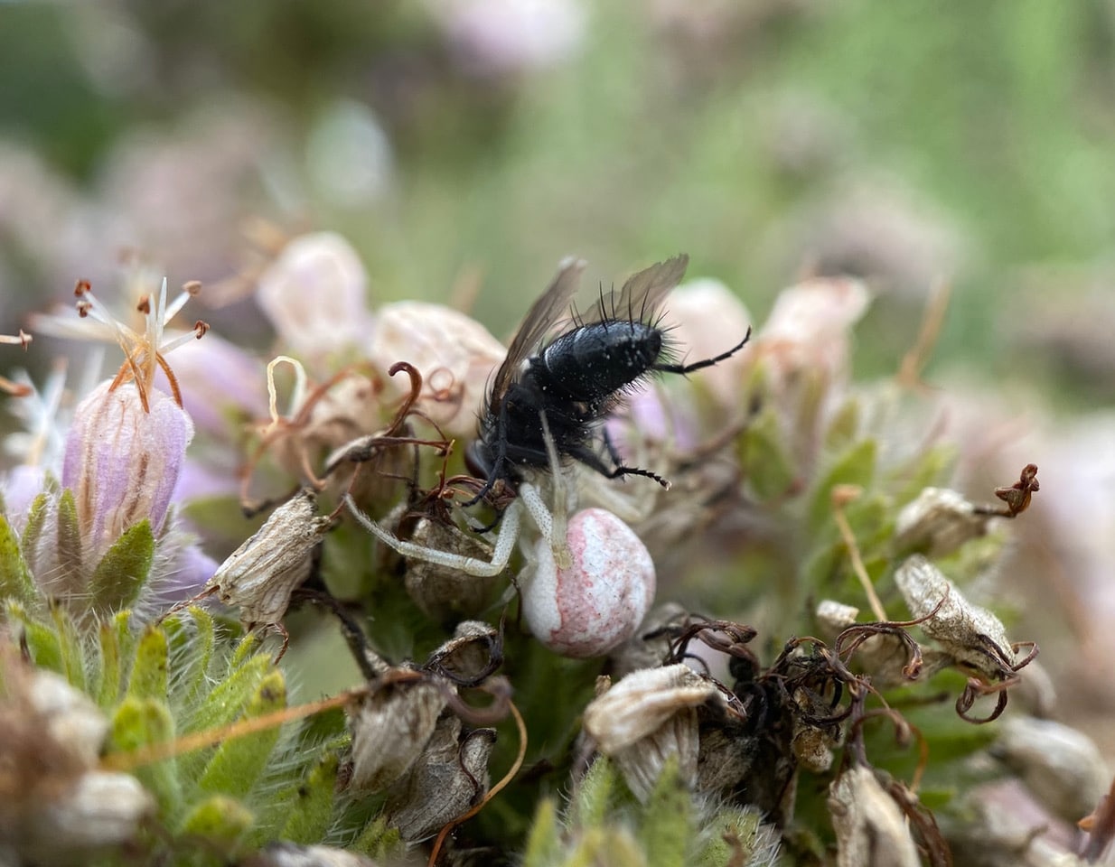 Viewed from a different angle, the Bristle Fly is being held up by a Crab Spider, Mecaphesa sp. (family Thomisidae). The spider is probably feeding on its prey.