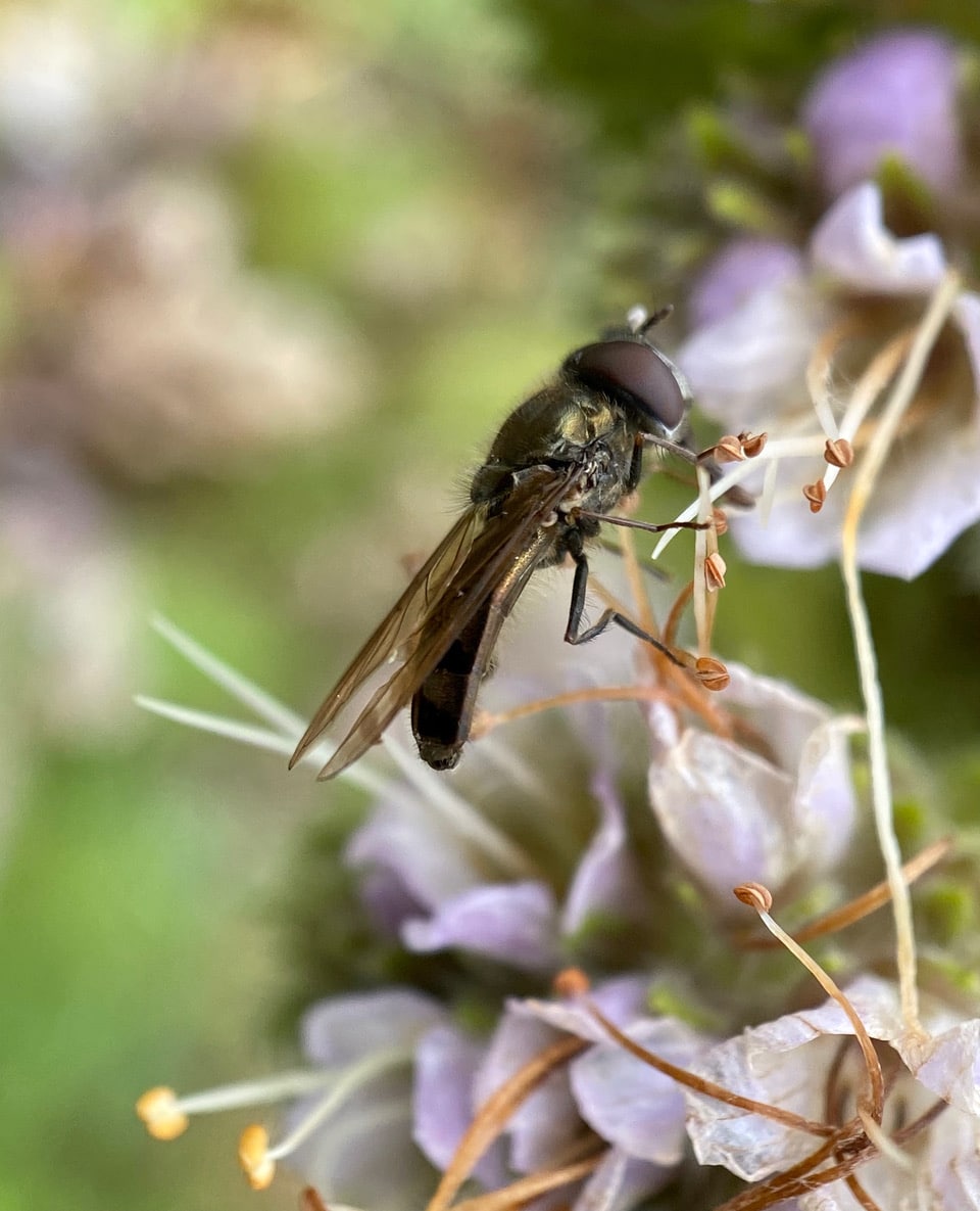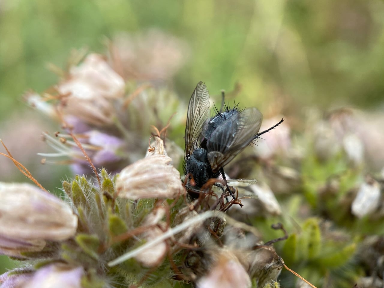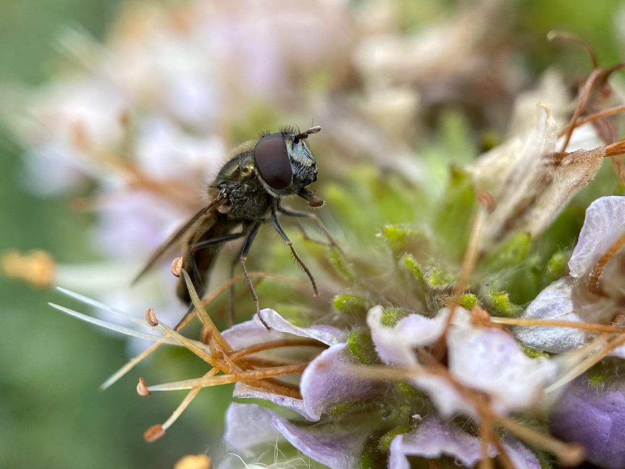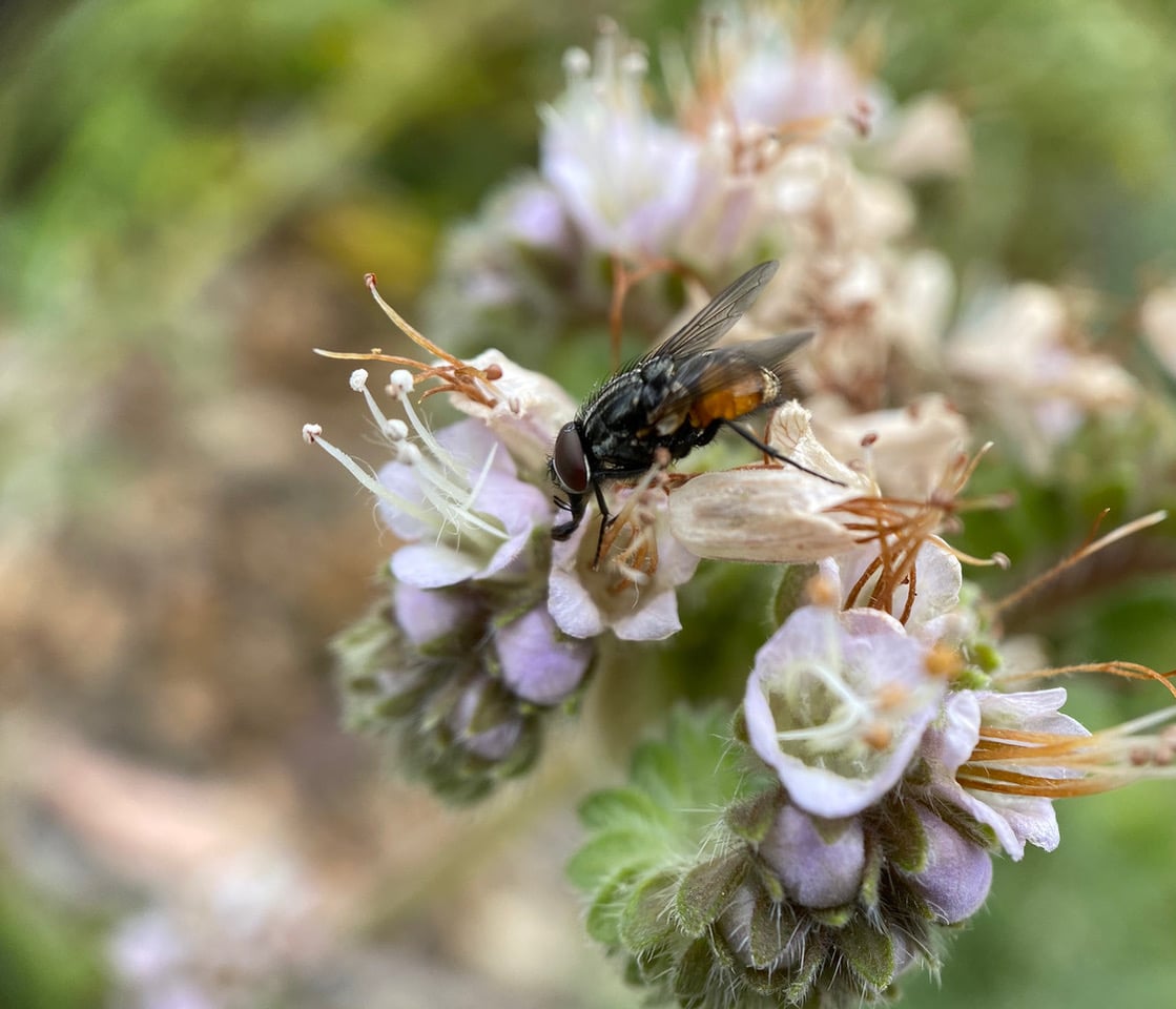 A Face Fly is actively moving around on an inflorescence of California Phacelia.