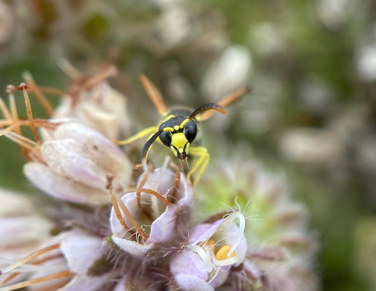 I encounter a few more of the bees with balding thorax. This individual is in the worst shape, wet and disheveled. She is moving around weakly on the inflorescence trying to sip nectar. Is this how old bees expire in the field?