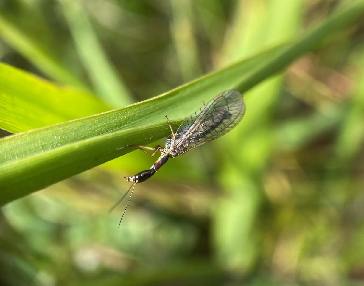 A Snakefly is perched quietly on a blade of grass.