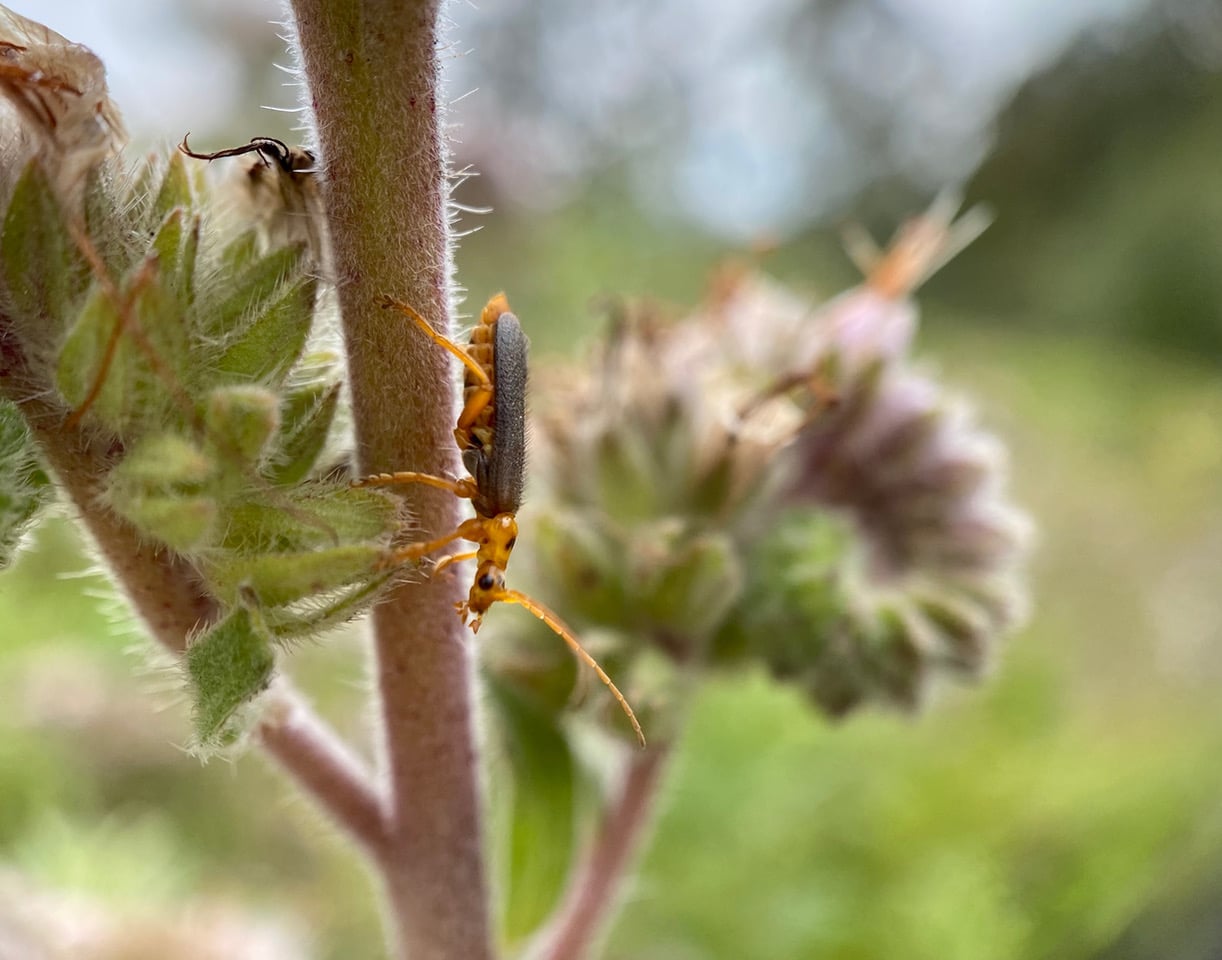 A Soldier Beetle, Cultellunguis americanus (family Cantharidae) is patrolling along a Phacelia stem.