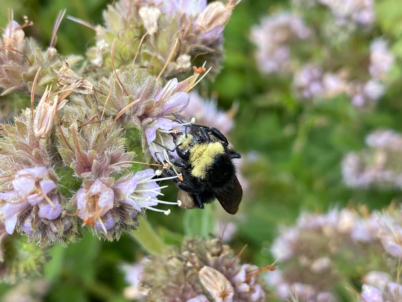 A dead but relatively intact Yellow-faced Bumble Bee, Bombus vosnesenskii is wedged between some Phacelia flowers. I look for a possible predator, such as a Crab Spider, but can’t find any. Did the bee die of old age? A sadness wells up in me. None of the books on bees have prepared me for this… There are things that the mind does not touch. They are simply felt by the heart.