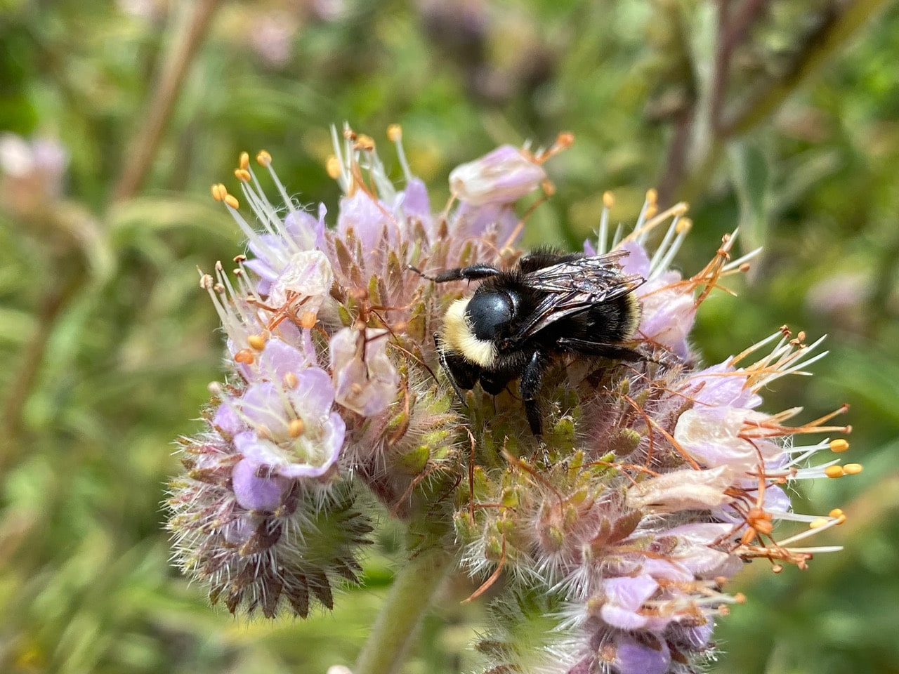Although it is still overcast, temperatures are in the 60’s, and many Yellow-faced Bumble Bees, Bombus vosnesenskii are out foraging on the California Phacelia, Phacelia californica. One particular individual is slumped over an inflorescence, barely moving. On closer inspection, I find that she has lost most the black hairs on her thorax, leaving a shiny black patch exposed. The tips of her wings are frayed. An old bee at the end of her life?