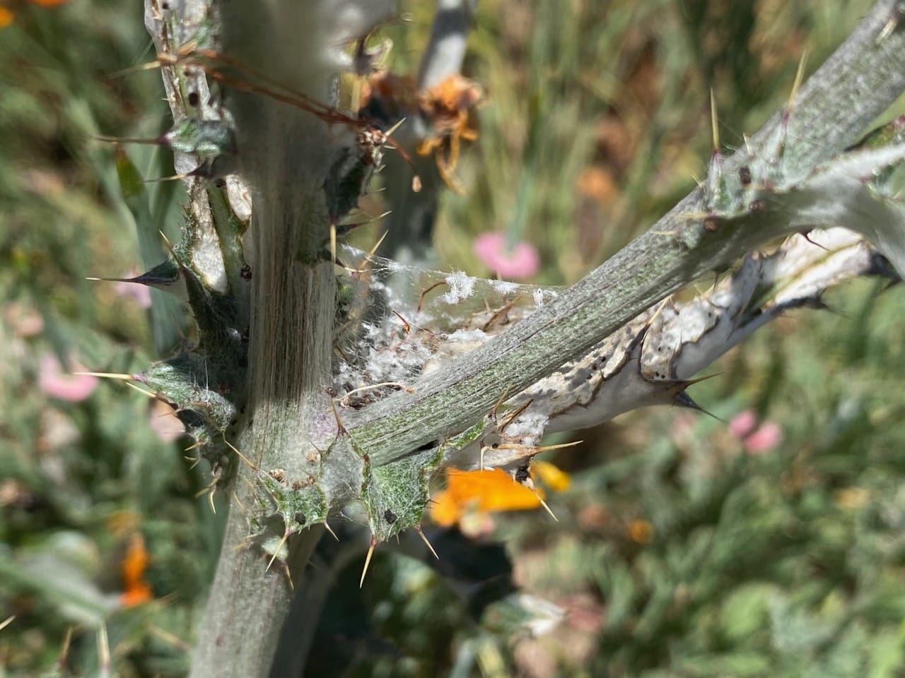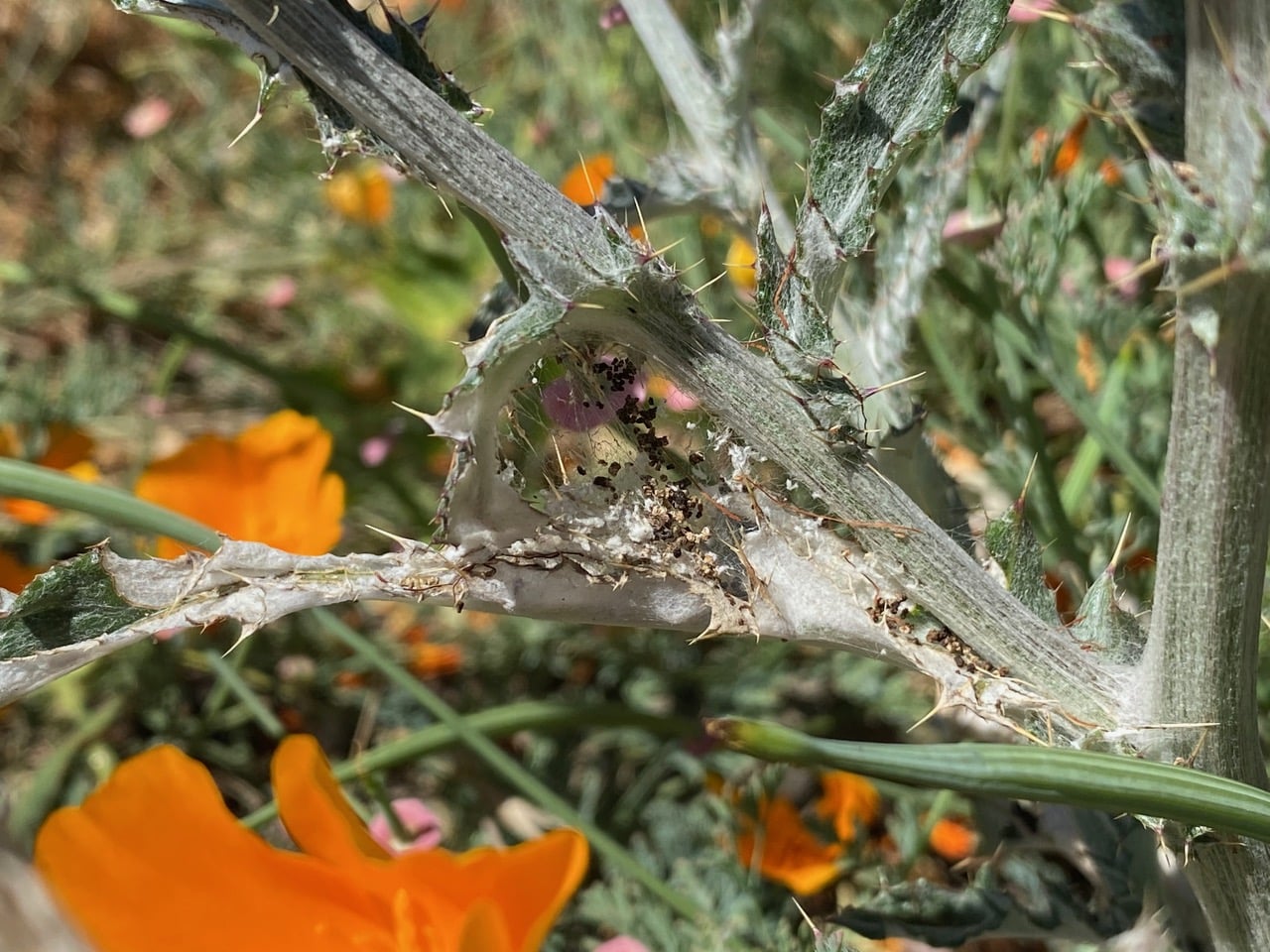 I check the base of the Cobweb Thistle for caterpillars among the spiky foliage. There are no visible caterpillars, but I find a couple of caterpillar retreats at the leaf axils, complete with silk webbing and frass (insect poop).