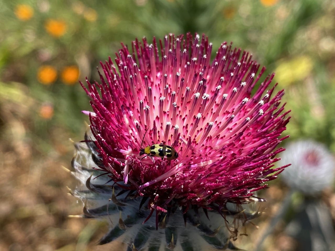 I was expecting to see Bumble Bees on the blooms of Cobweb Thistle, Cirsium occidentale. Nope, the bees are not here today. Instead, a few Spotted Cucumber Beetles are foraging on the flowerheads.