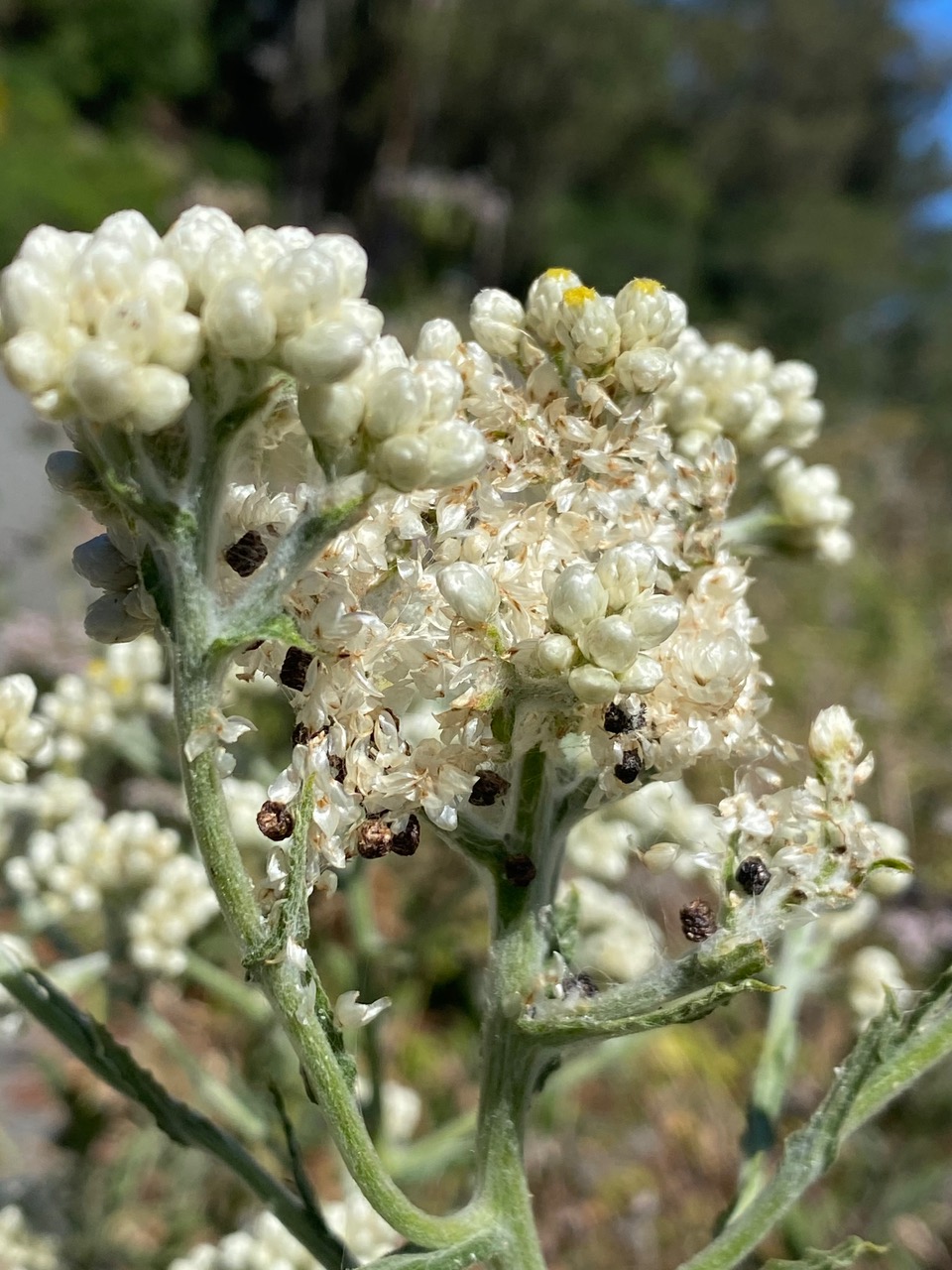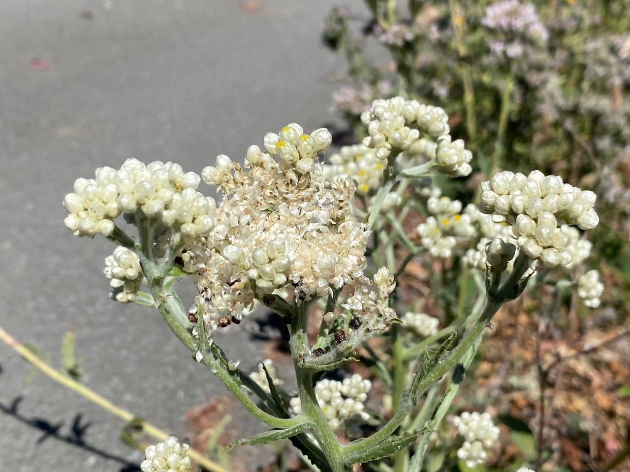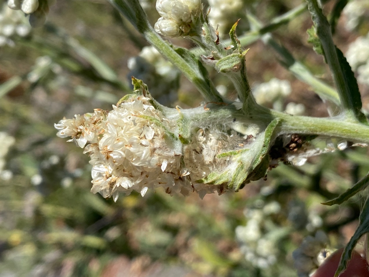 Some California Everlasting, Pseudognaphalium californicum are already in bloom along the paved road near the Radio Tower. That inflorescence of the California Everlasting, Pseudognaphalium californicum looks suspiciously untidy. Some parts are just a jumble of loose phyllaries (bracts that surround the actual tiny flowers). Who’s responsible for the rearrangement of the flower parts? I bet it’s a caterpillar of the American Lady butterfly, Vanessa virginiensis!