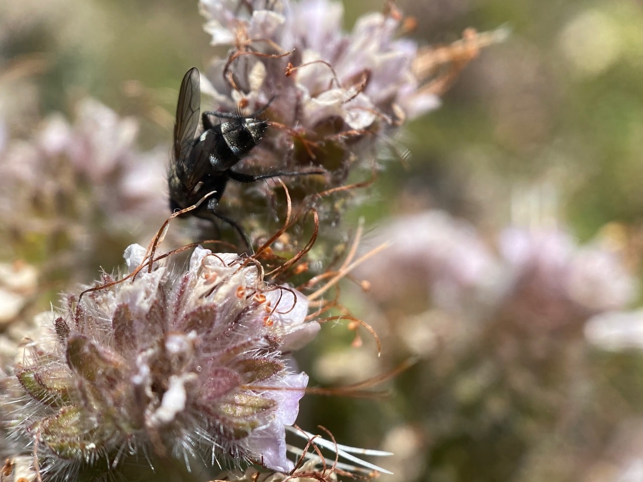 A Woodlouse Fly, Stevenia deceptoria (family Rhinophoridae) is perched on an inflorescence of California Phacelia. These small, slender, black, bristly flies are somewhat related to the Tachinidae. The larvae are mostly parasitoids of woodlice (pill bugs), beetles, spiders and other arthropods, and occasionally snails.