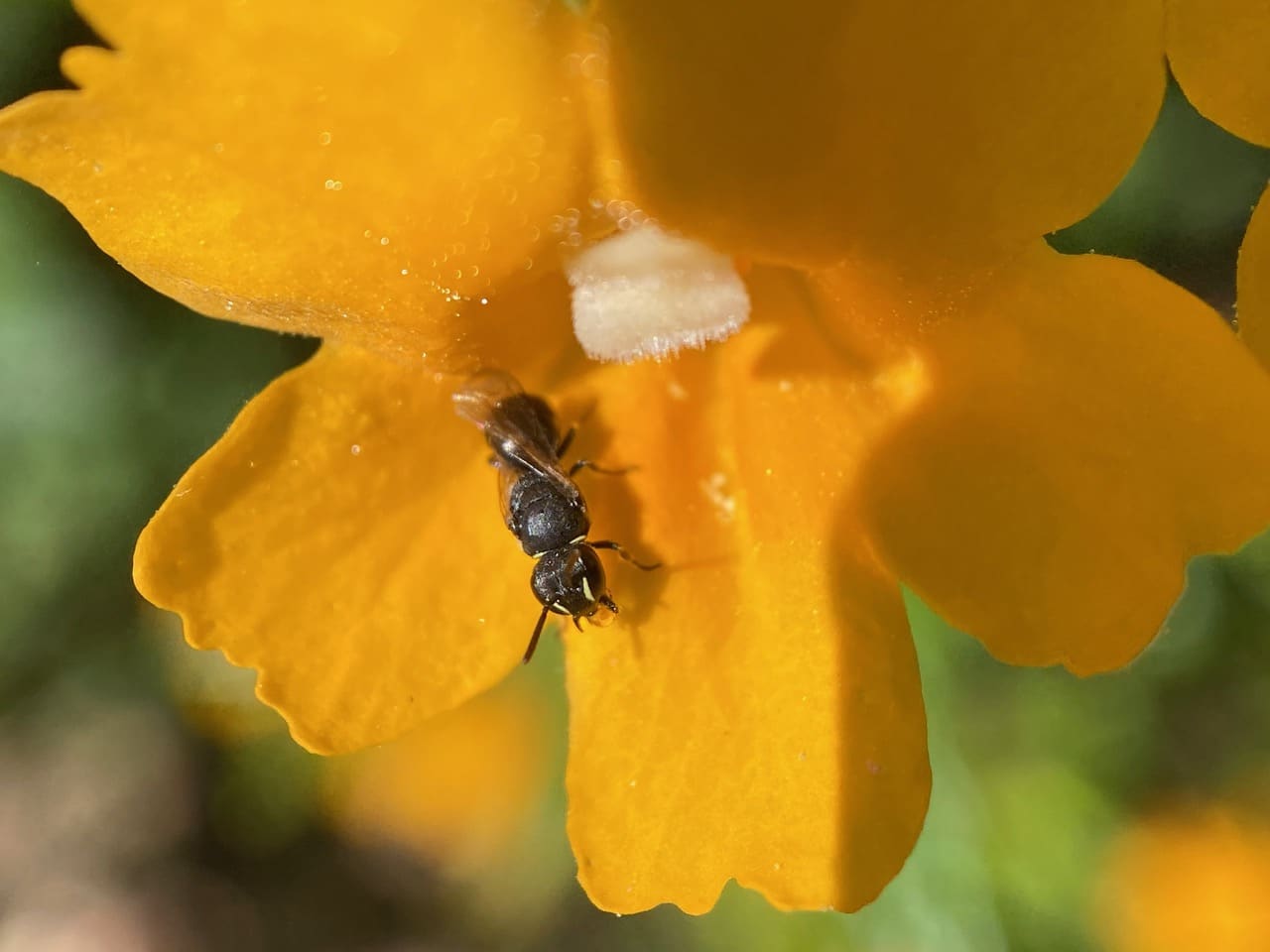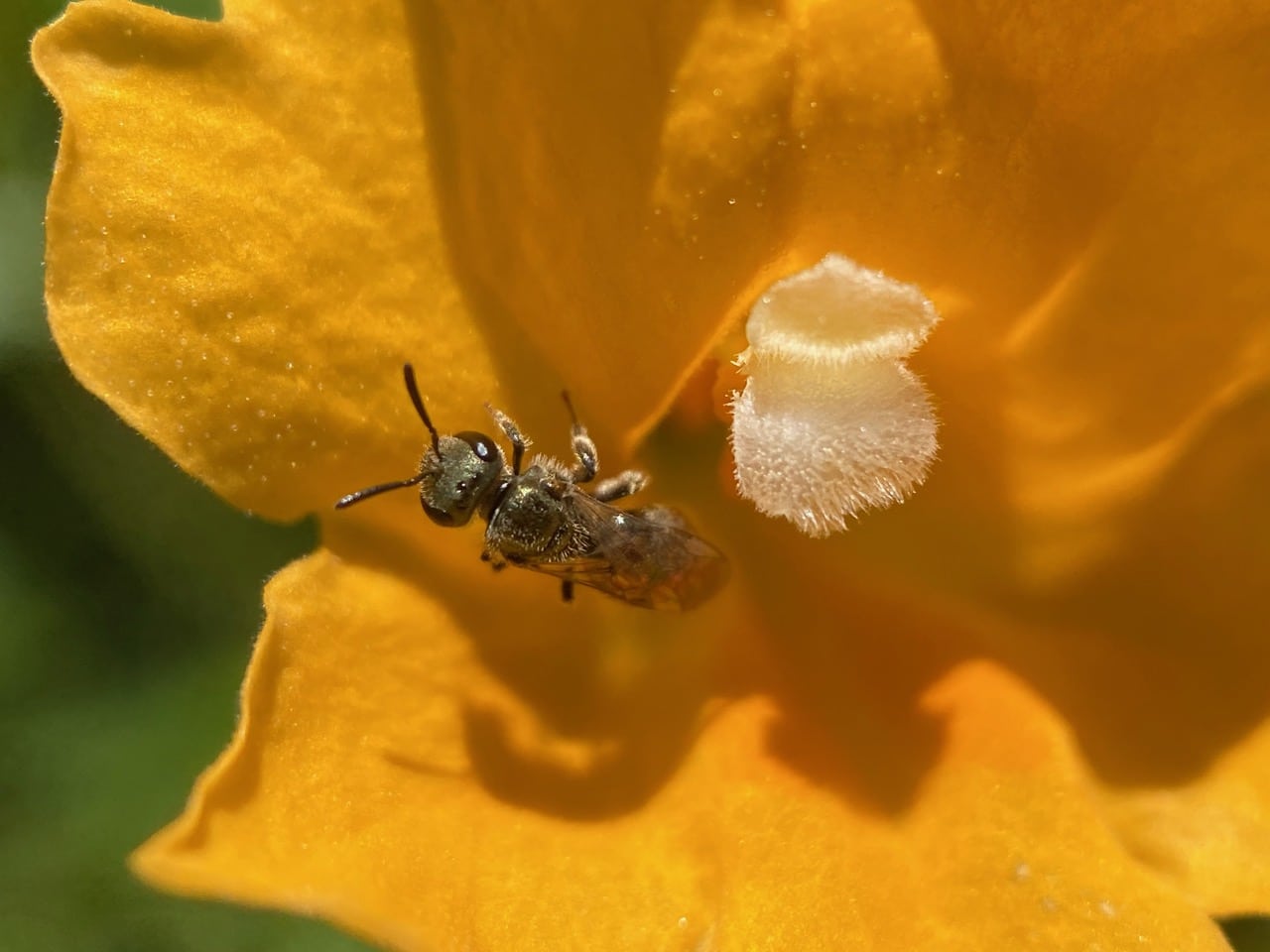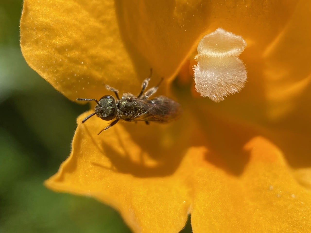 As I am photographing the stigma of the Sticky Monkeyflower, a shiny dark bee exits from the floral tube.