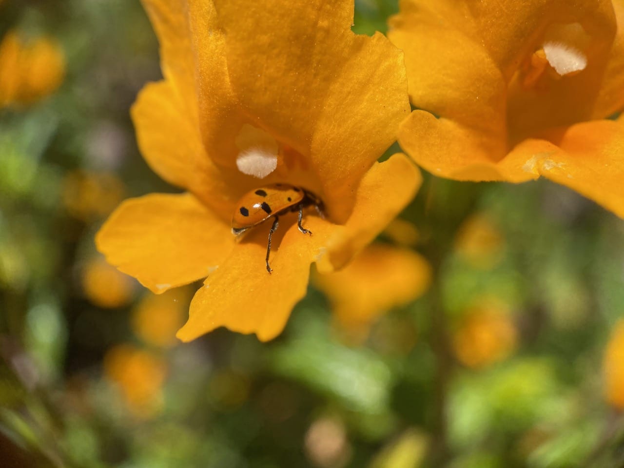 A Convergent Ladybeetle, Hippodamia convergens (family Coccinellidae) is entering a Sticky Monkeyflower. Is it hunting small insects, or is it scavenging for pollen? For the main part, ladybeetles are predatory, feeding on small insects. However, they are also known to feed on pollen and nectar when prey is scarce.