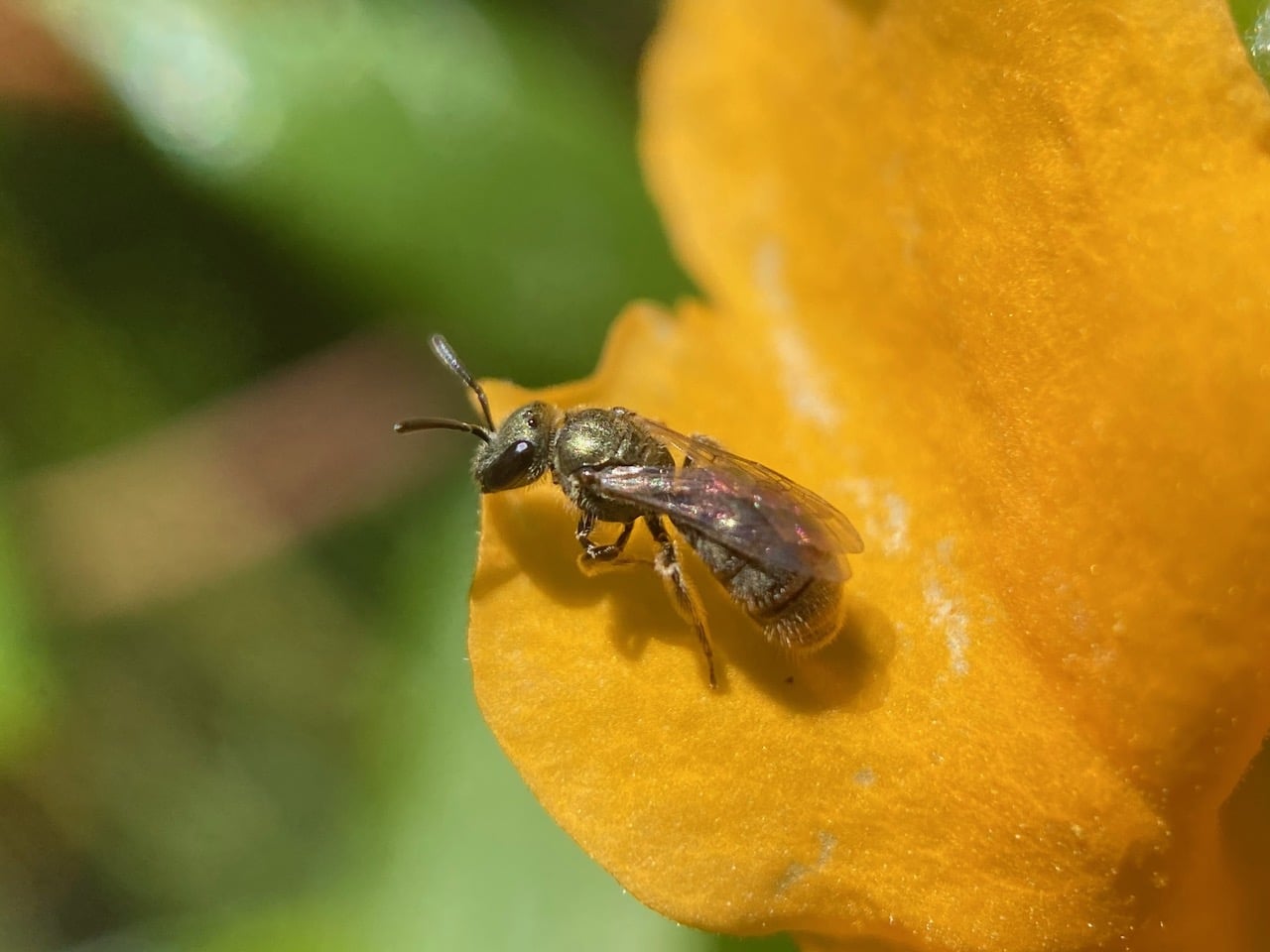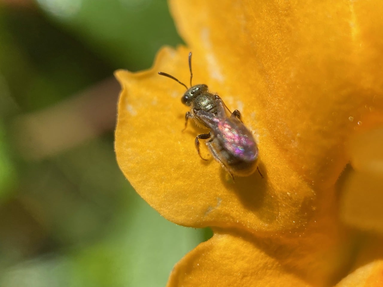 Could this be a male Metallic Sweat Bee? It doesn’t seem to have much of a scopa on its hind legs, and its antennae are long. Male bees do not collect pollen, but will visit flowers for nectar.