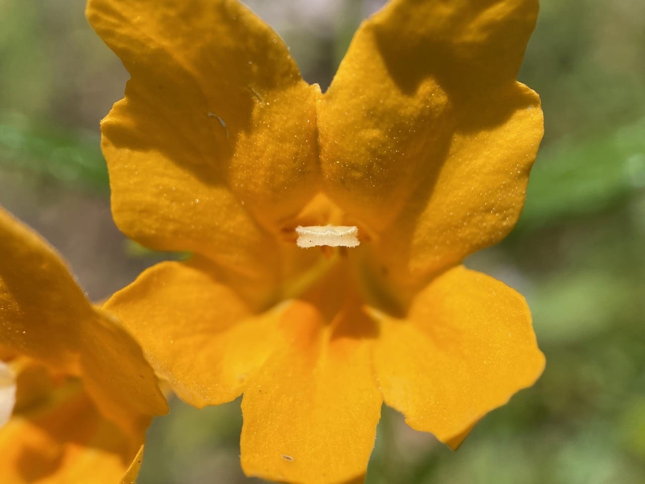 The Sticky Monkeyflower, Diplacus aurantiacus is approaching peak bloom. A pair of bright orange-yellow flowers appear to be welcoming pollinators with their white two-lobed stigmas open wide.
