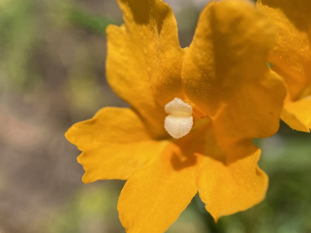 On fresh Sticky Monekeyflowers, the two stigmatic lobes are spread apart, presenting their receptive surfaces for pollination. But once the stigma is touched, either by a bee or your finger, the lower lobe moves upward to meet the upper lobe, closing up the stigmatic surface within seconds. (This is fun to watch in real time!) The movement in response to touch is called thigmotaxis. If no pollen has been deposited, the stigma will open up again. If pollination has occurred, the stigma is permanently closed. This is a clever way the flower prevents self-pollination. When a pollinator backs out of the floral tube after feeding on nectar or pollen, its body covered in pollen, the stigma is still closed, unable to receive pollen from its own flower.