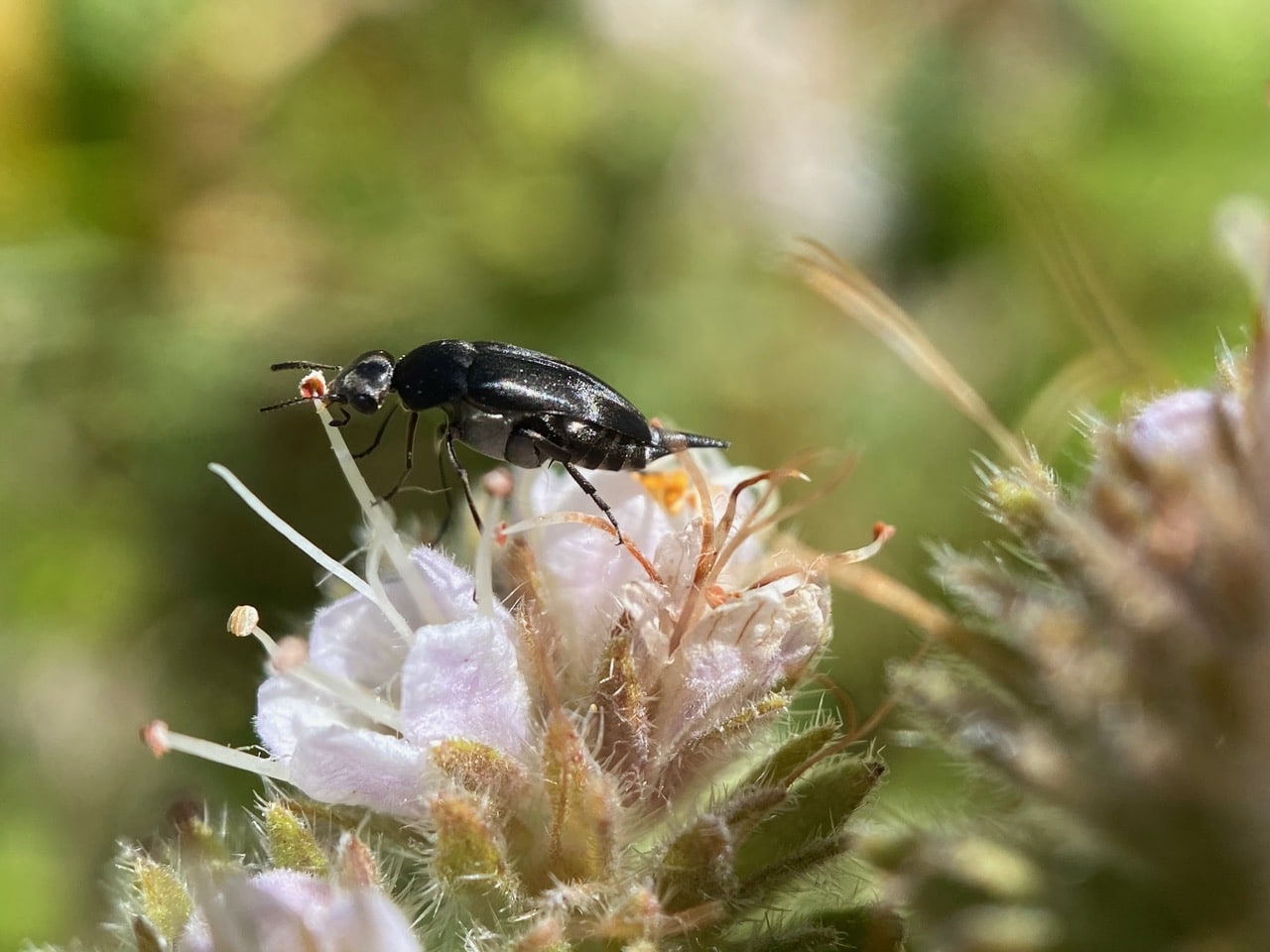 A Tumbling Flower Beetle (family Mordellidae) is feeding on pollen from an anther of a California Phacelia flower. It is uncommon to see the head of the beetle – it is usually kept low under the humped thorax.