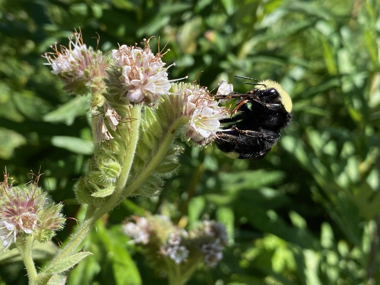 Wow, that’s a huge Yellow-faced Bumble Bee – she’s got to be a queen. Probably a newly minted one, not a hair out of place. She’s not collecting pollen, but is only taking nectar from the Phacelia flowers. On a fine day soon, she will go off on her nuptial flight to mate with a male from a different colony. She and the other new queens will be the only ones in their colony to overwinter. They will emerge from their hibernation early next spring to establish new colonies. Much depends on the health of these new queens.