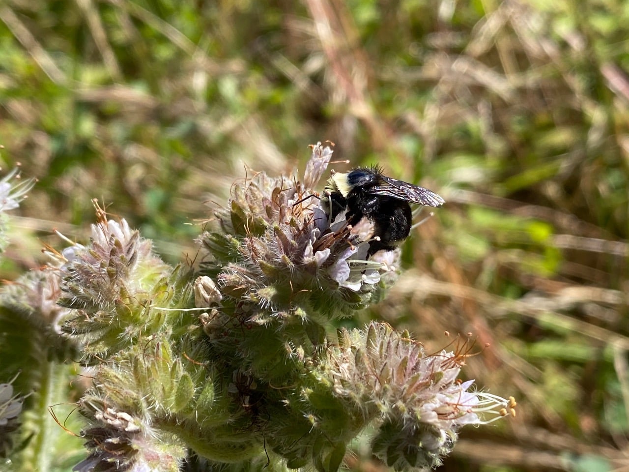 The bumble bees are busy buzzing around the California Phacelia, Phacelia californica. Some of the worker bees are looking well worn with balding thorax, but still work just as hard.