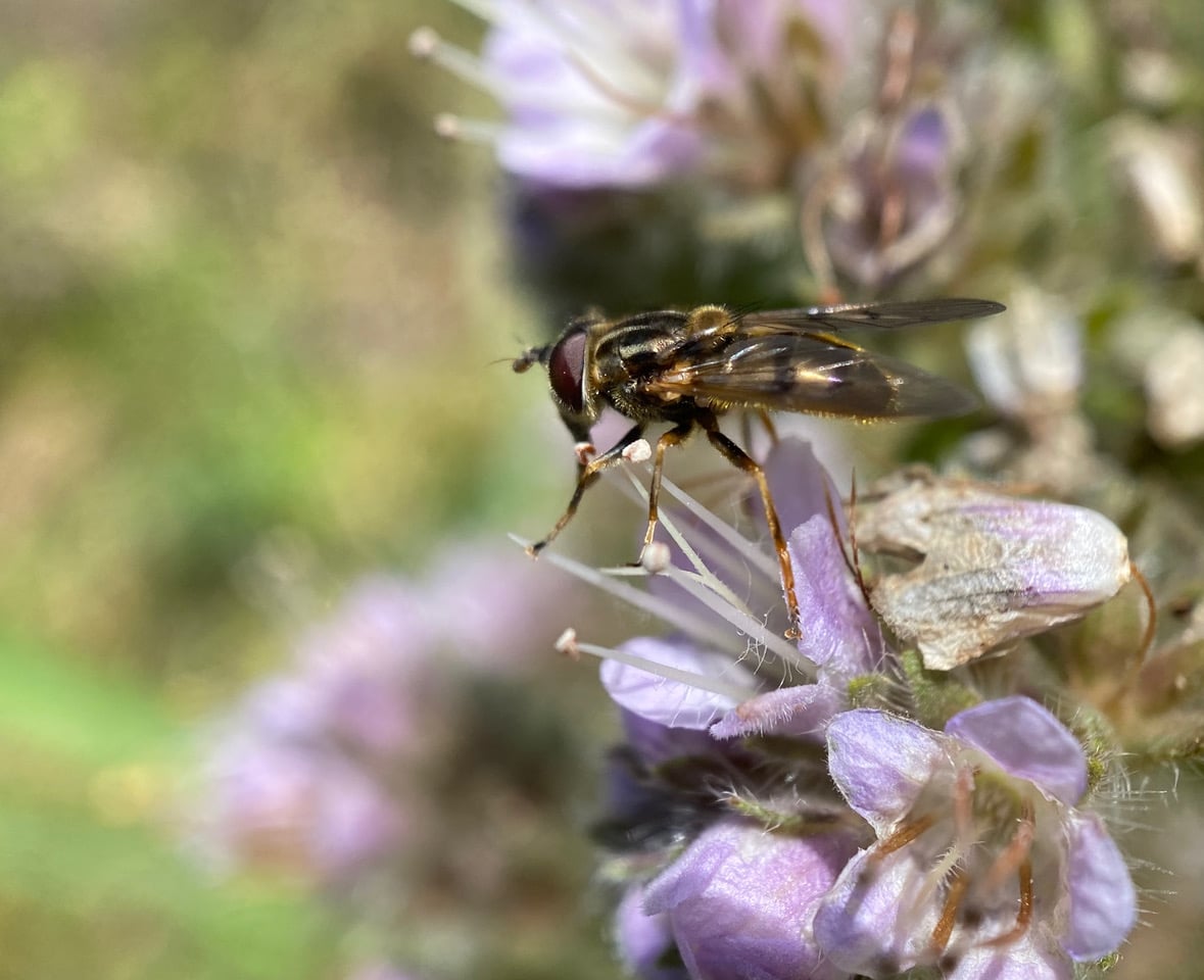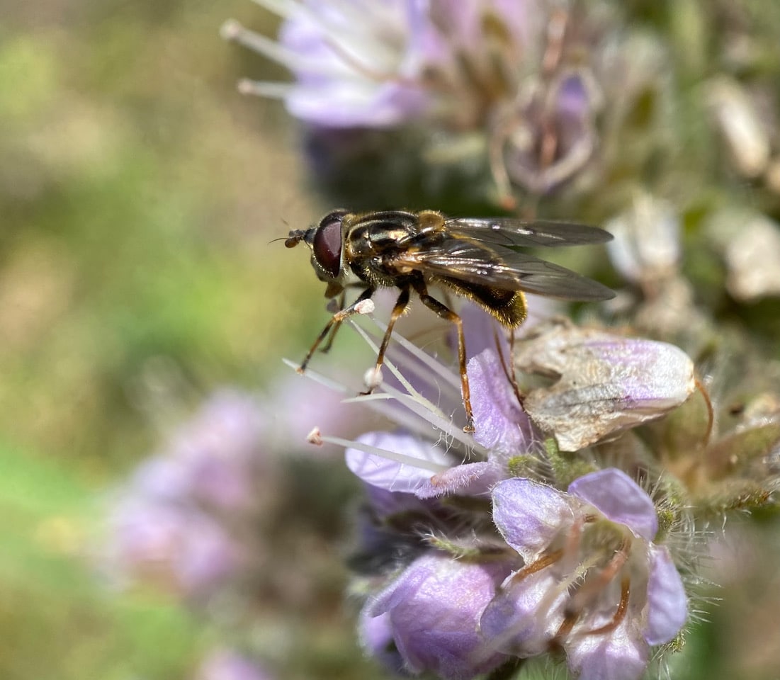 A flash of coppery shine leads my eyes to this fly on the Phacelia flowers. One look, and I know that this is a new species of Hover Fly for me – Yay! At certain angles, it has the dull, dark appearance of the Sedgesitter Hover Fly, Platycheirus sp. But its shape is less elongate, and it has the stripes on the thorax, absent in the Sedgesitter.