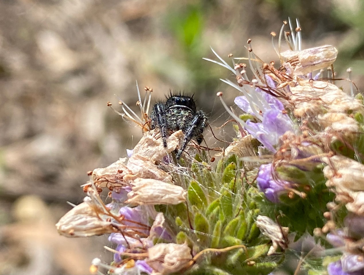 A huge female Red-backed Jumping Spider, Phidippus johnsoni (family Salticidae) is sitting on the edge of a California Phacelia inflorescence. (Males of the species have a plain red abdomen.) Judging from the profusion of silk lines criss-crossing the spot, she must have been busy hunting from here.