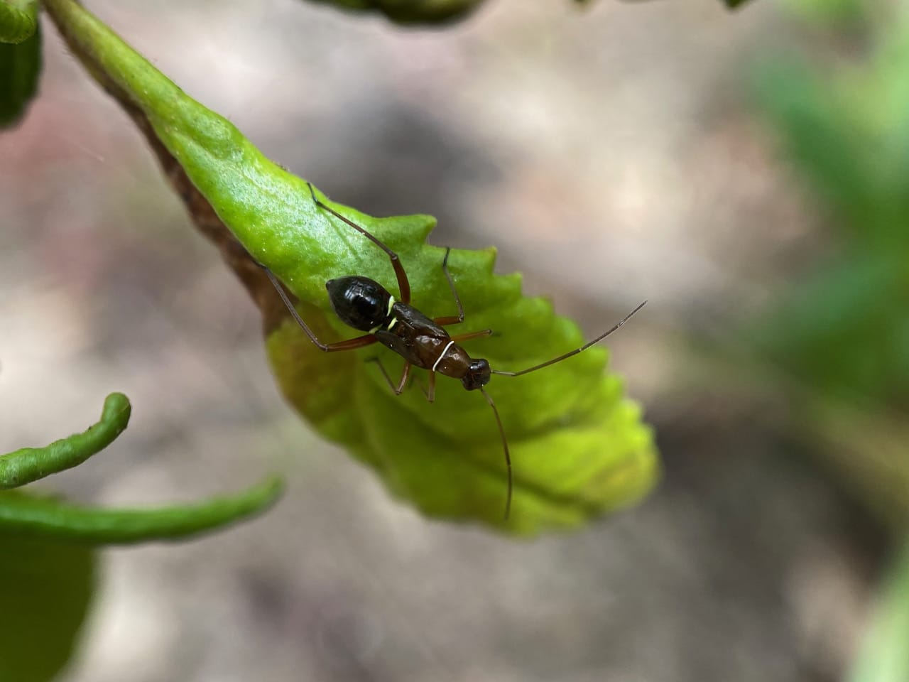 This angle of the nymph shows the rostrum (the piercing-sucking mouthpart diagnostic of the order Hemiptera) folded under its body. This is definitely not an ant. The antennae are also a give-away – they are not geniculate (elbowed) as in the ants. Insect antenna forms – BugGuide.Net