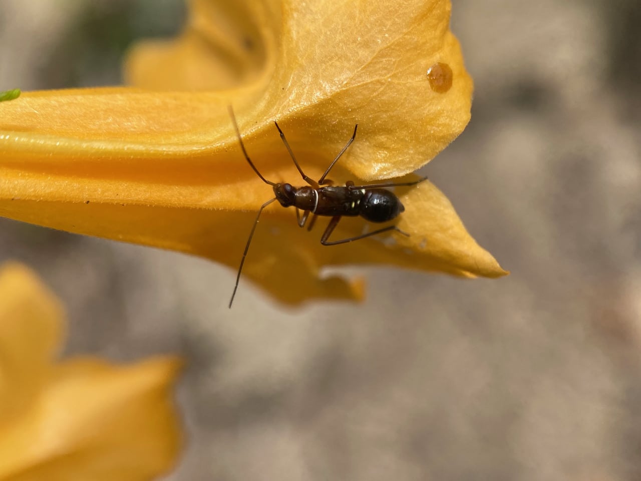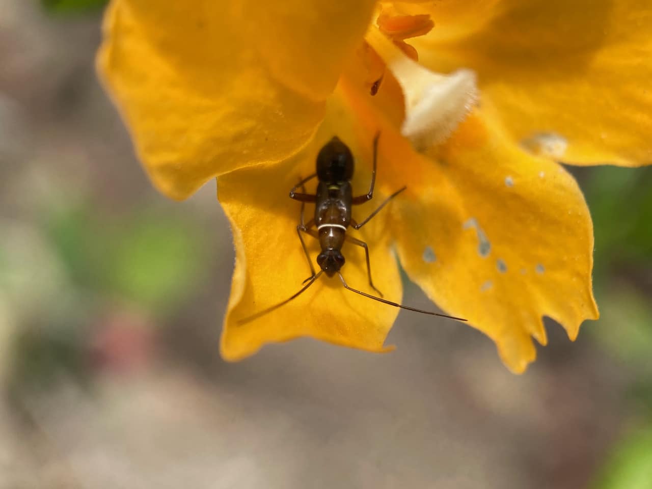 The wary nymph runs to the back of the flower. See any resemblance to an ant?