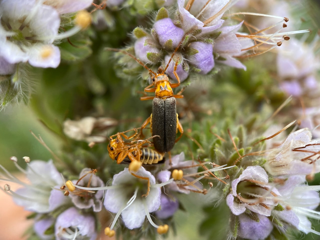 A pair of Soldier Beetles, Cultellunguis americanus (family Cantharidae) is mating while moving around on an inflorescence of California Phacelia, Phacelia californica. The female is dragging along the docile male lying on his back, looking rather uncomfortable. I often see this behavior in this species, but the beetles can engage in sex in a number of positions worthy of the Kama Sutra.