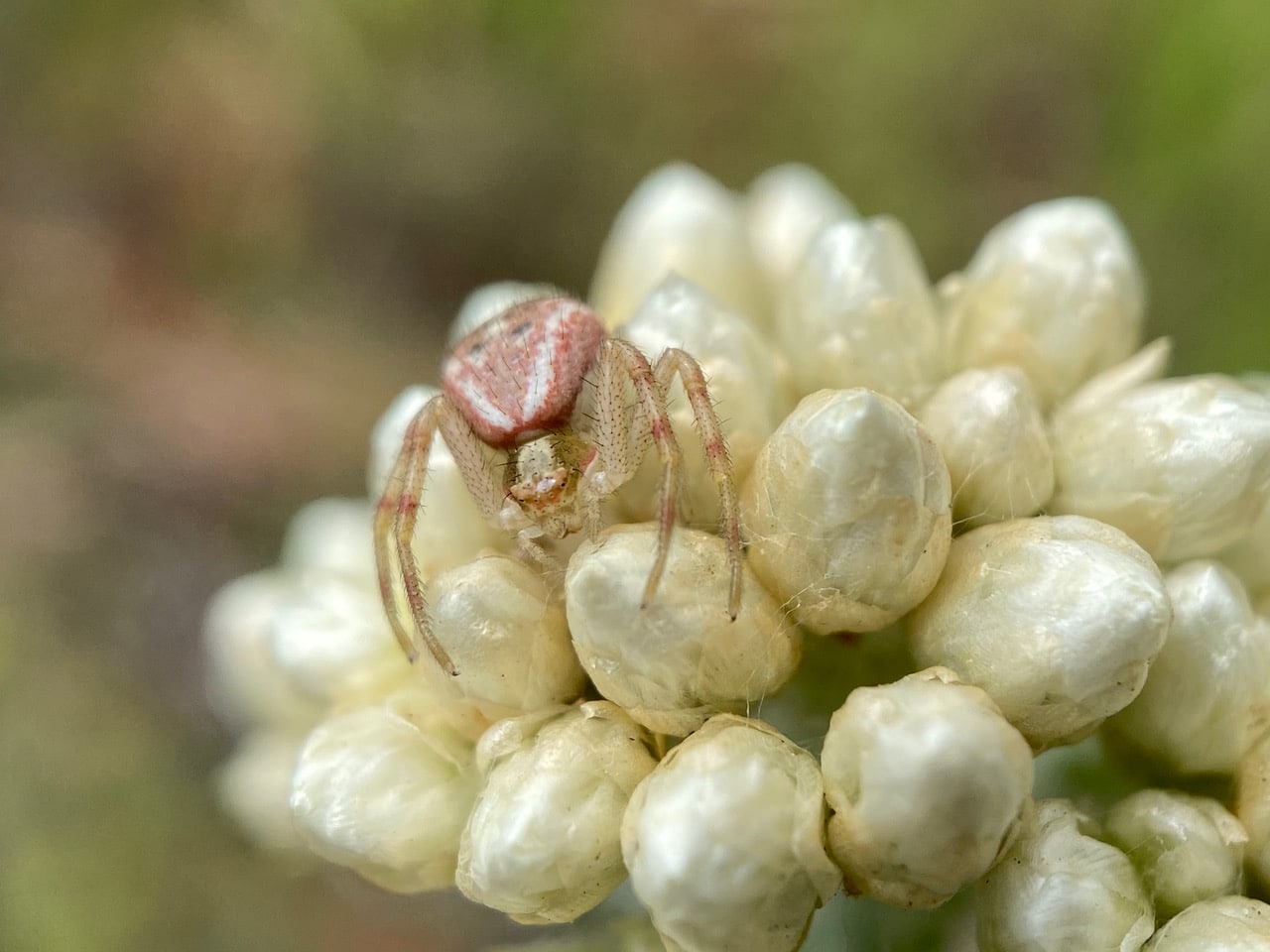 Over the past few weeks, I have often found small Crab Spiders, Mecaphesa sp. (family Thomisidae) hunting in ambush on the inflorescence of California Everlasting. This one has grown pretty large. Life is good here!