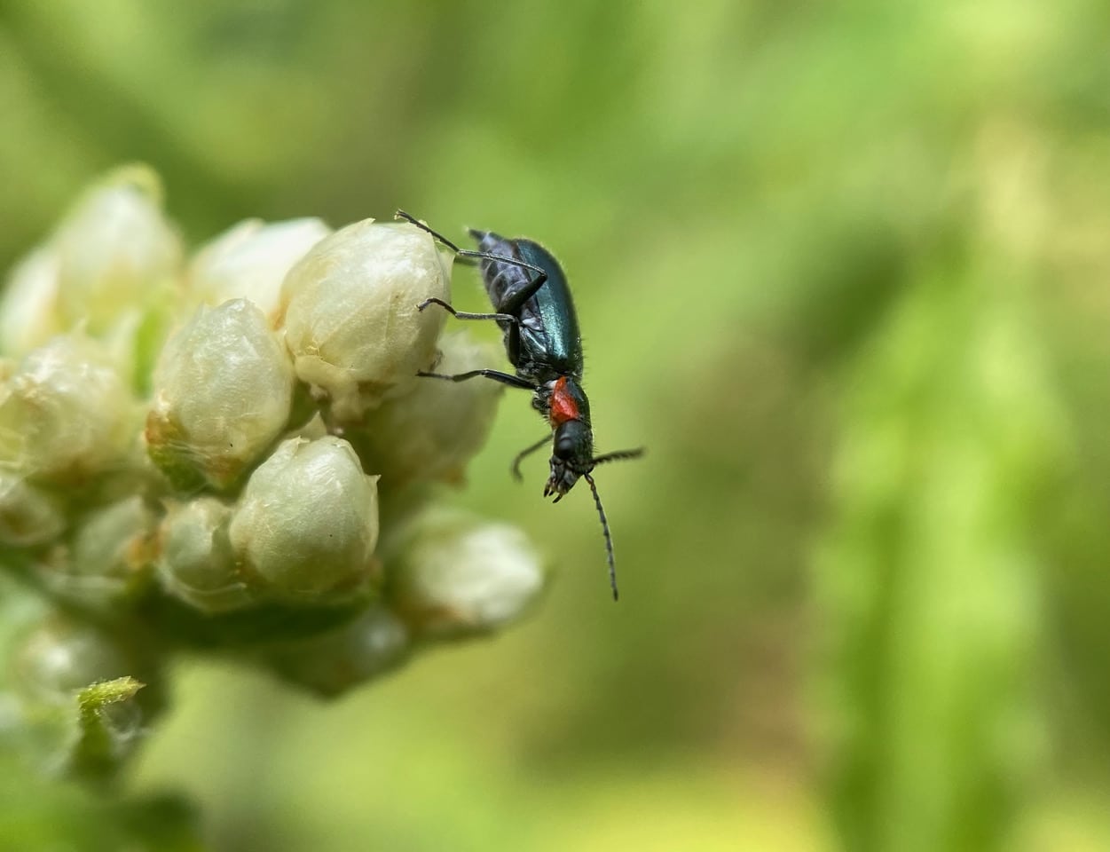 The Malachite Beetle (subfamily Melachiinae) is a member of the family of Soft-winged Flower Beetles (family Melyridae). Most Melyrids are elongate-oval, soft-bodies beetles 10 mm or less in length. Members of the subfamily Malachiinae have peculiar orange structures along the sides of the abdomen which can be everted, but usually kept hidden. Most adults and larvae are predaceous. Omnivorous adult Melyrids are often found on flowers out in the open, where they feed on pollen, insect eggs, and flower-loving insects that land within their grasp. The larvae generally stay concealed under tree bark or leaf litter or soil, where they prey on other invertebrates.