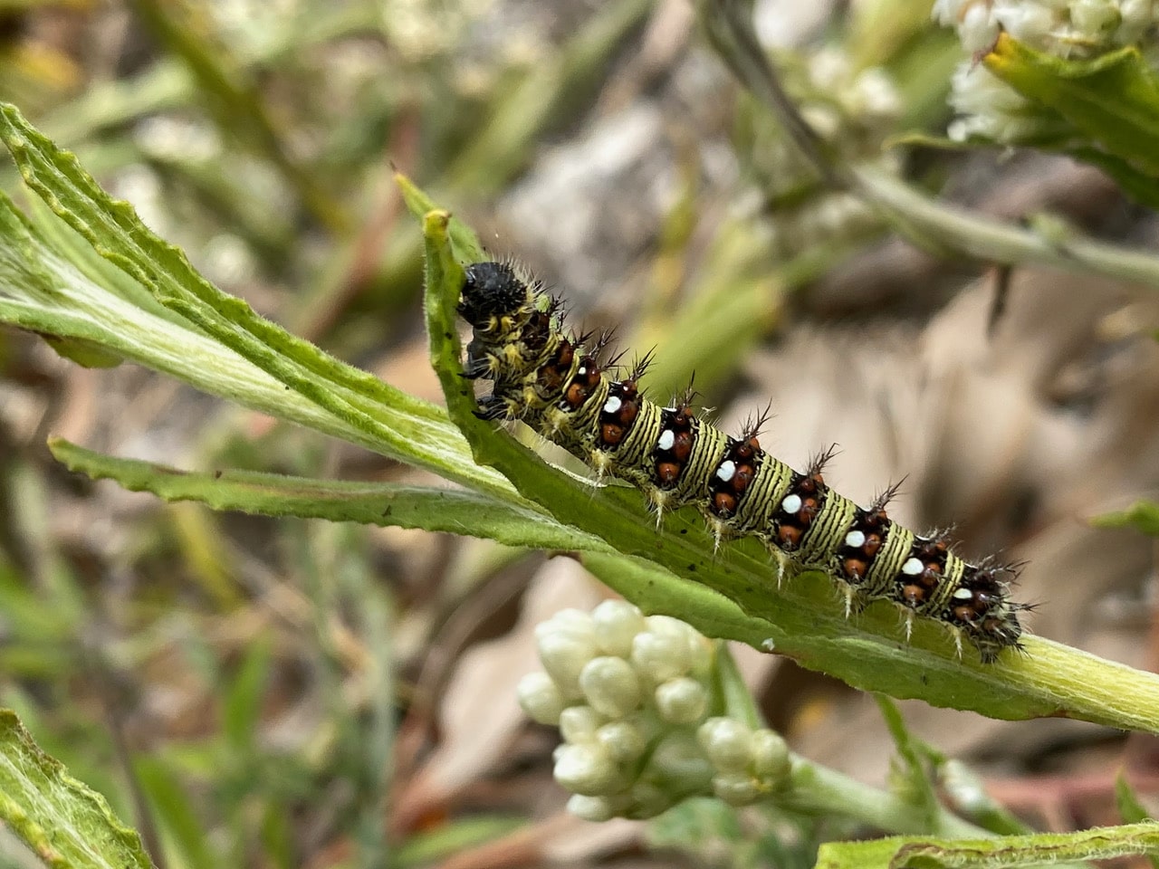 Wow, so fortunate to come across an American Lady caterpillar, Vanessa virginiensis (family Nymphalidae) feeding out in the open on a California Everlasting, Pseudognaphalium californicum. For the past two weeks, I have been observing the half dozen caterpillar nests, large and small on the plant, hoping to catch a glimpse of the caterpillar. It is about 11/2 in. long now, probably close to pupation.