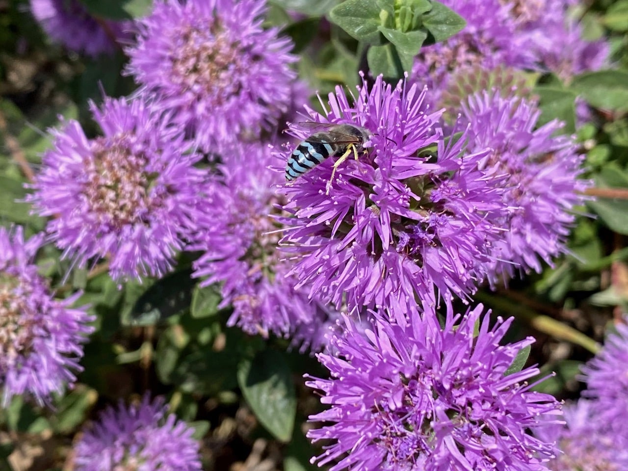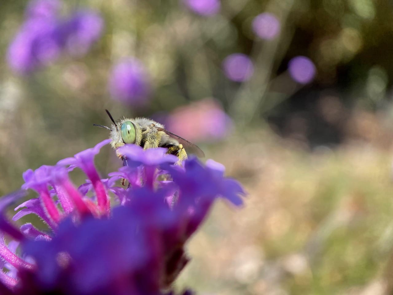 The Coyote Mint, Monardella villosa is blooming gloriously, and there’s a pandemonium of insect activity. The bees and wasps are literally bumping each other off the flowerheads. It’s a challenge to focus on anything.