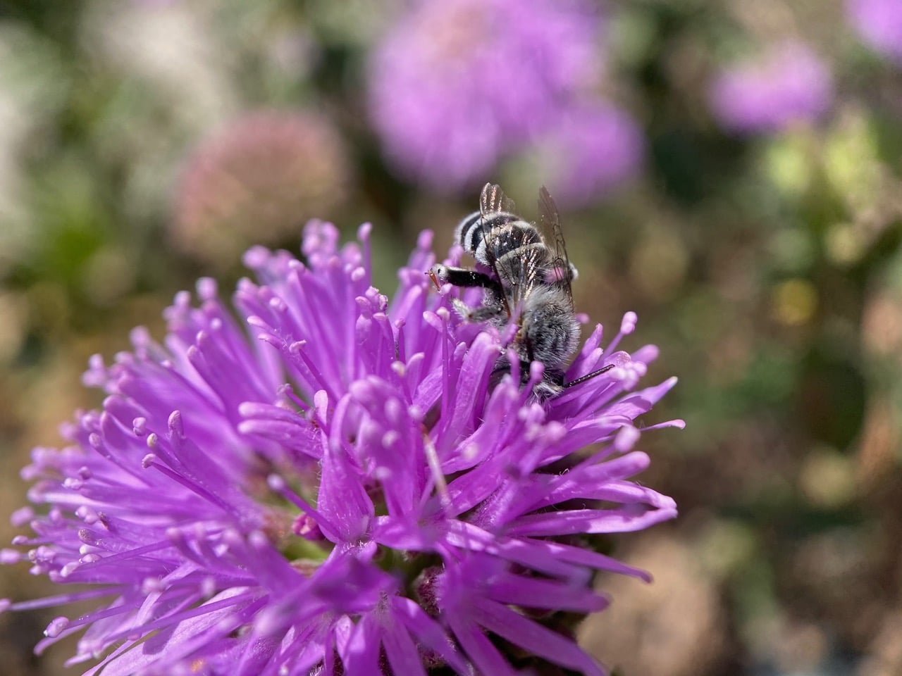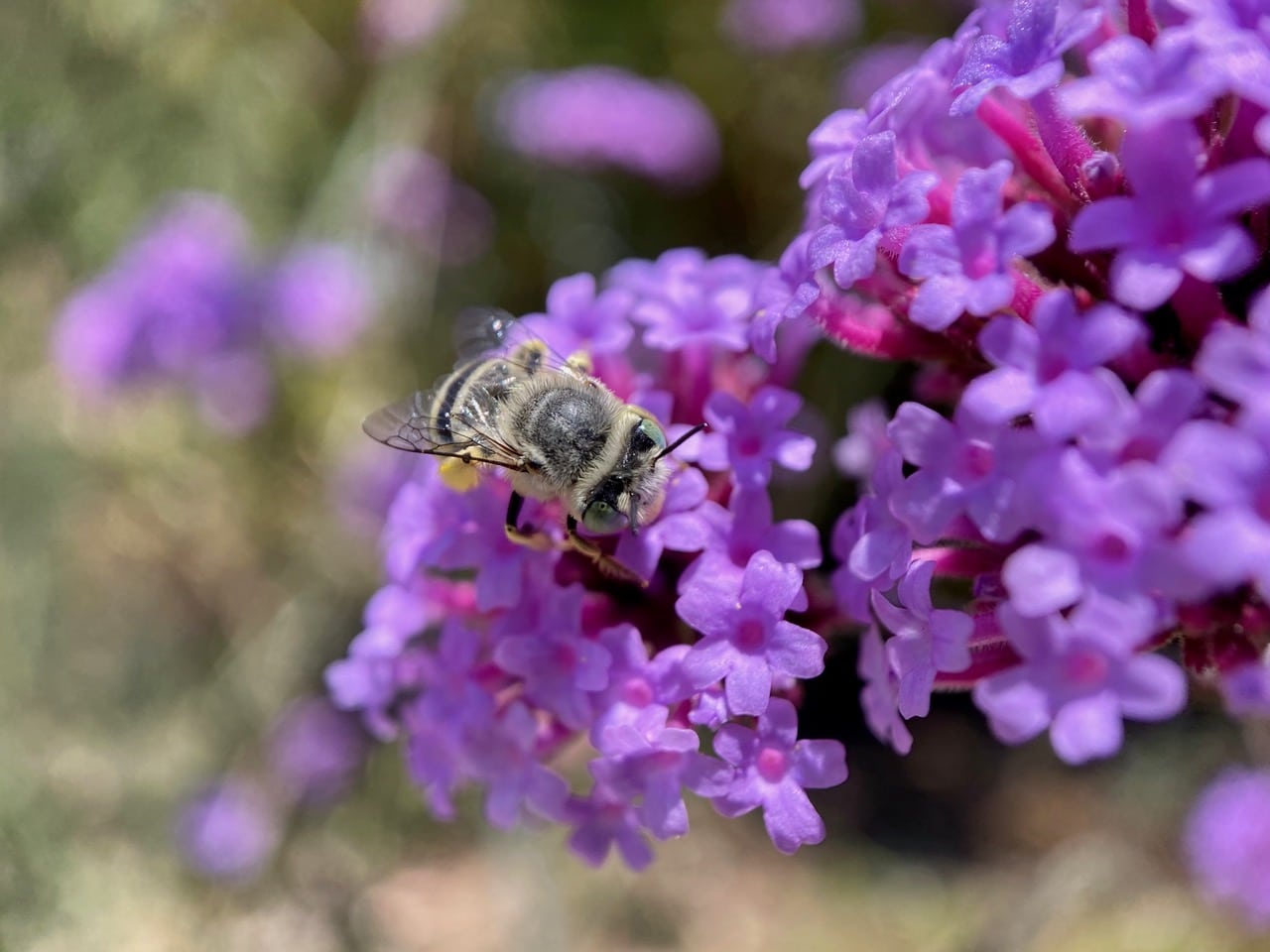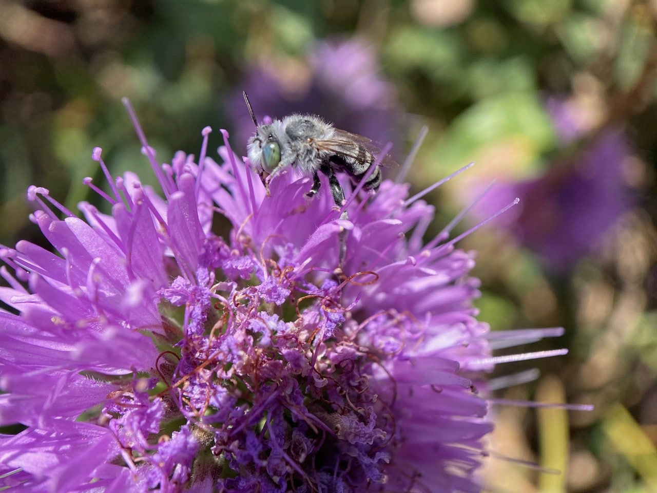 A small stout bee with pale milky blue eyes and black-and-white banded abdomen is foraging on a Coyote Mint flowerhead. A bee specialist on iNaturalist has helped identify the bee as a Short Sun-digger Bee, Anthophora curta (subgenus Micranthophora, family Apidae). The species is native to North America, and prefers dry, desert-like habitats.