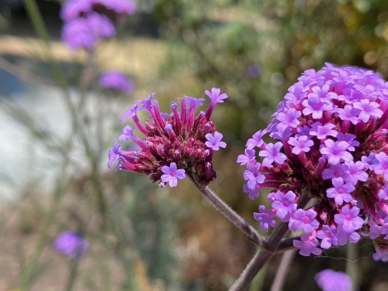 Growing right next to the Coyote Mint is a Purpletop Vervain, Verbena bonariensis with large clusters of small purple tubular flowers.