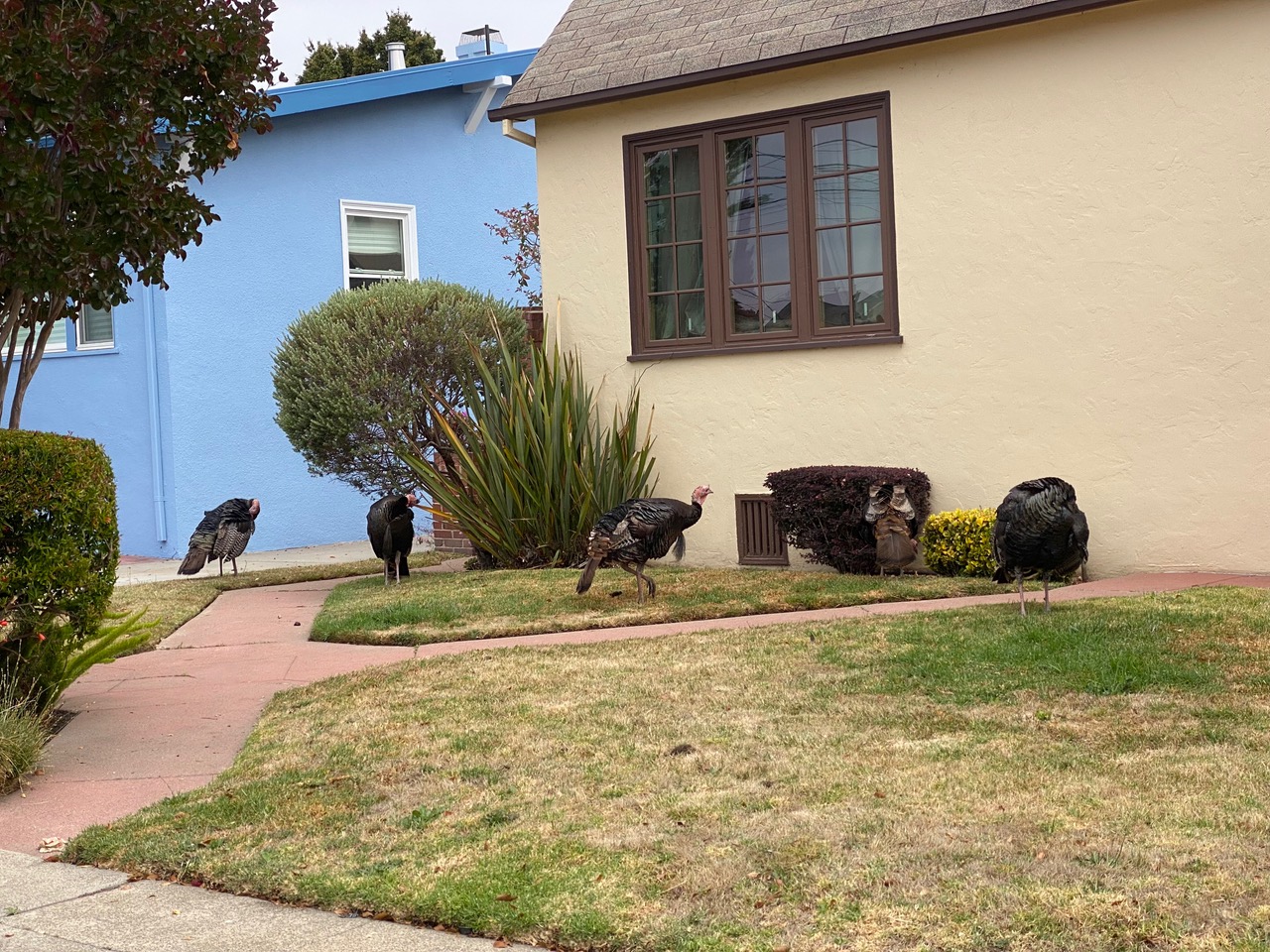 When I look up from the flowers, I find five large turkeys preening themselves on the lawn. How bizarre! This is a busy street with constant traffic. Where did the turkeys come from?
