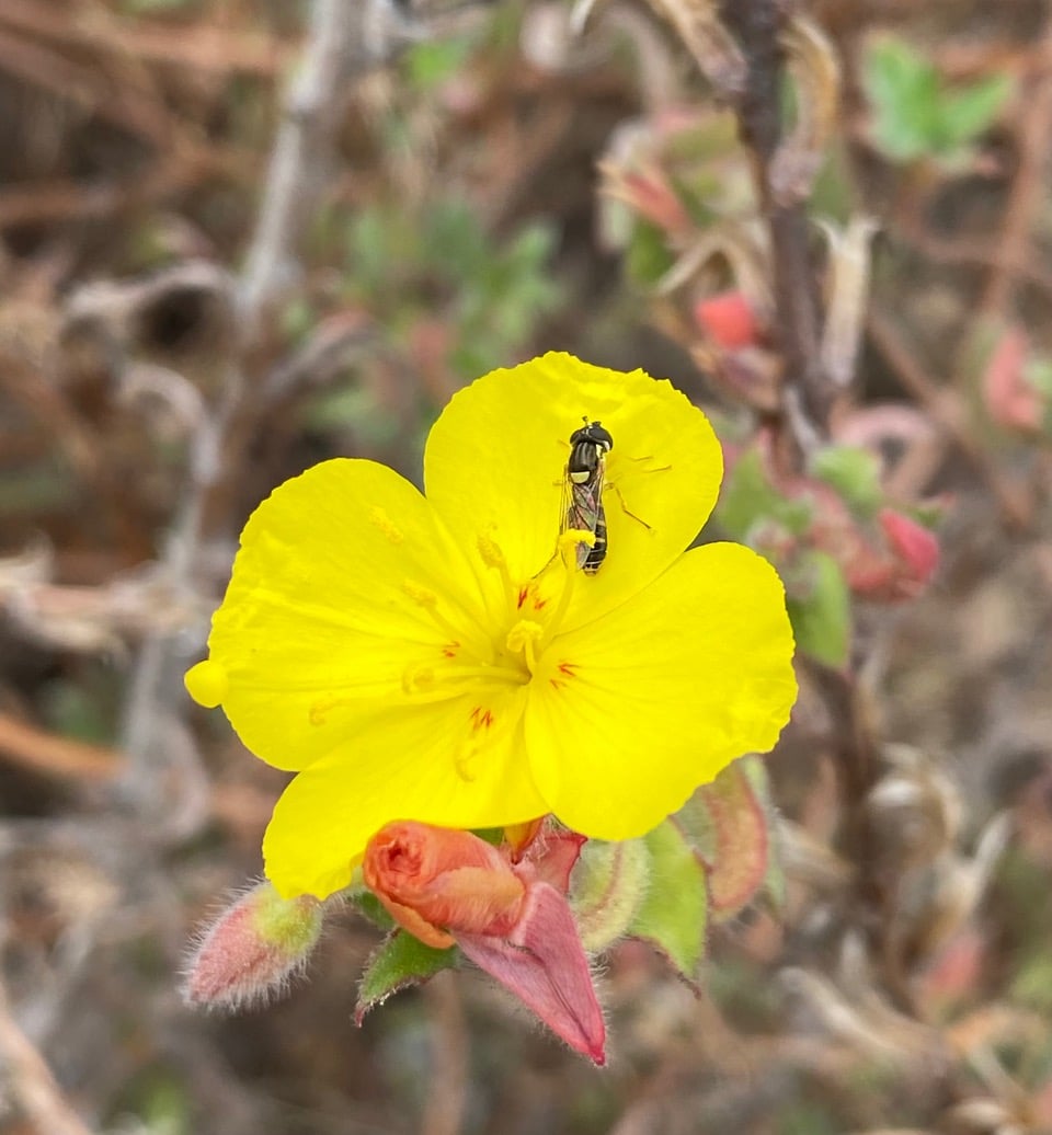 A female Forked Globetail, Sphaerophoria sulphuripes (family Syrphidae) visits a flower of the Beach Evening Primrose, Camissoniopsis cheiranthifolia.