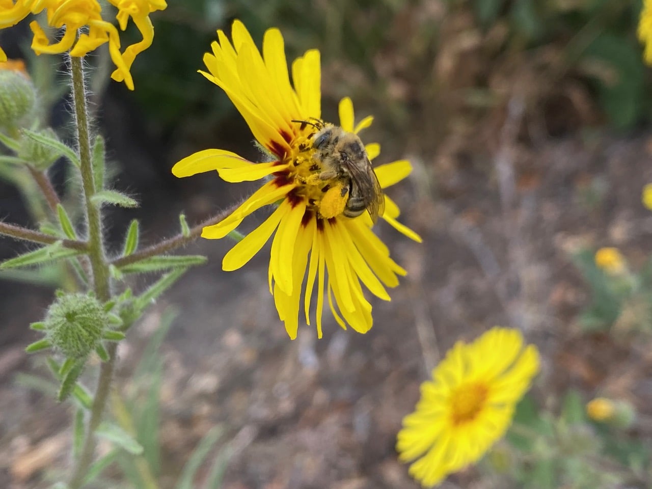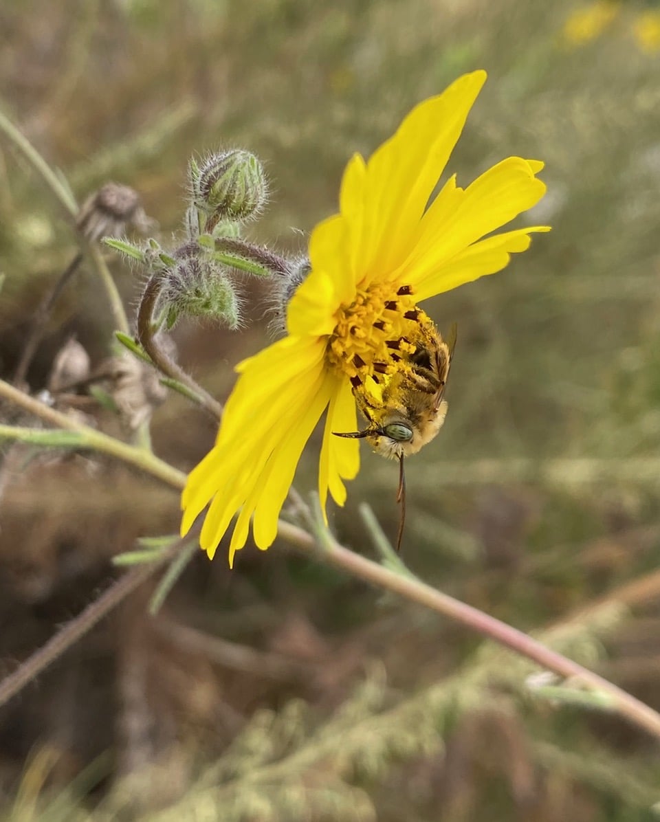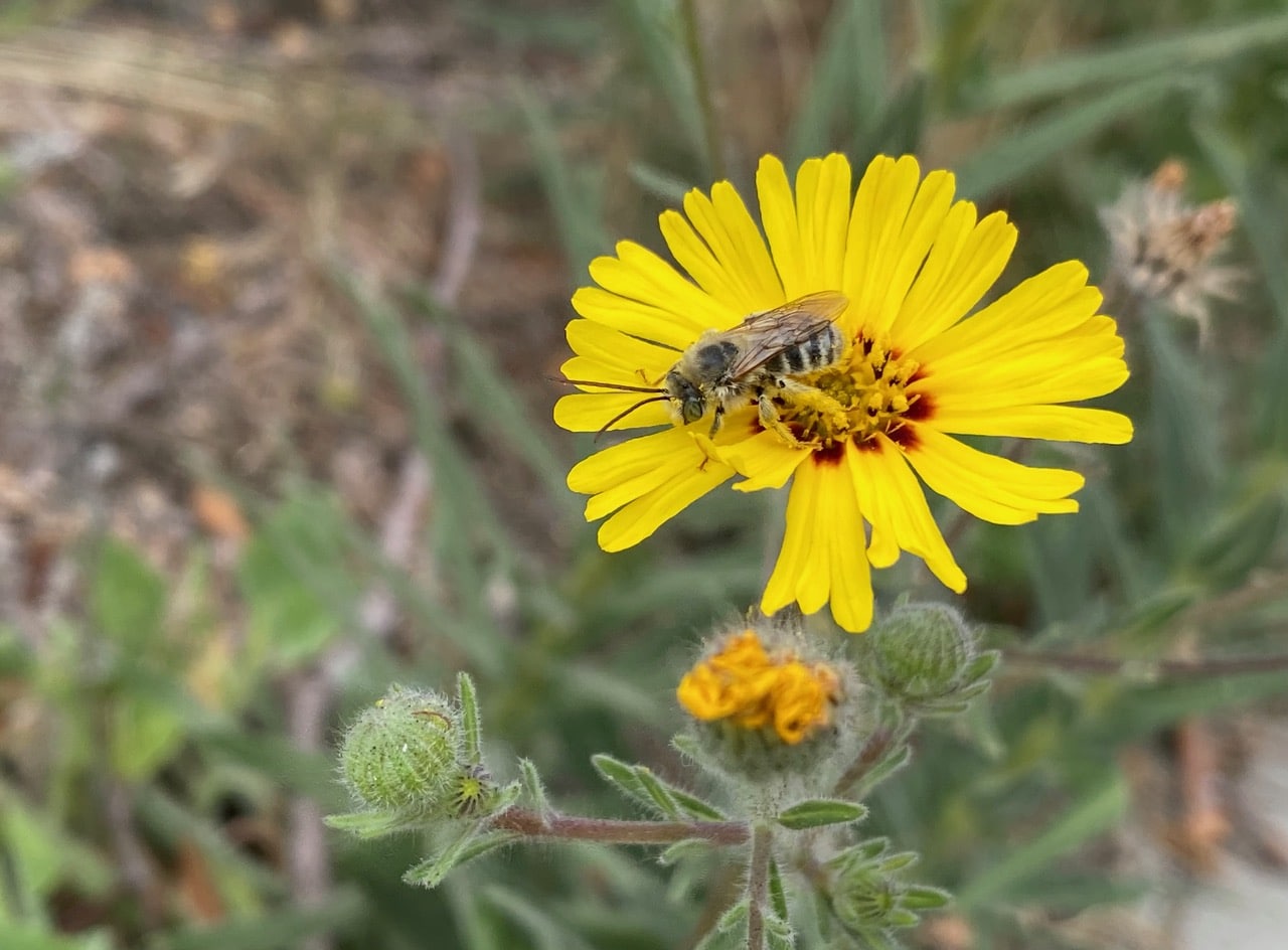 Even before the males wake up, a female Summer Longhorn Bees, Melissodes sp. (family Apidae) is out foraging on the Elegant Tarweed, Madia elegans, her scopae already bulging with pollen.