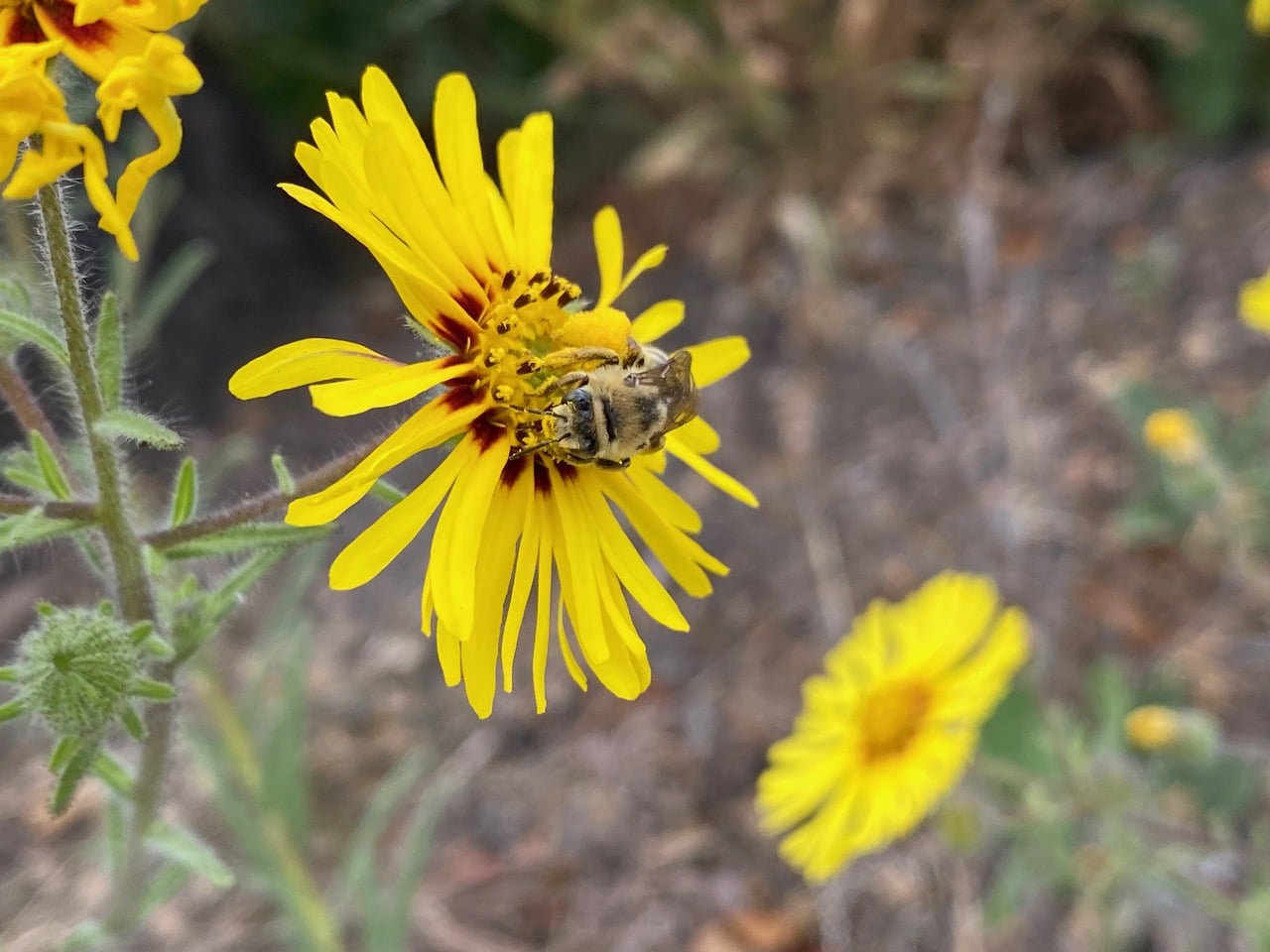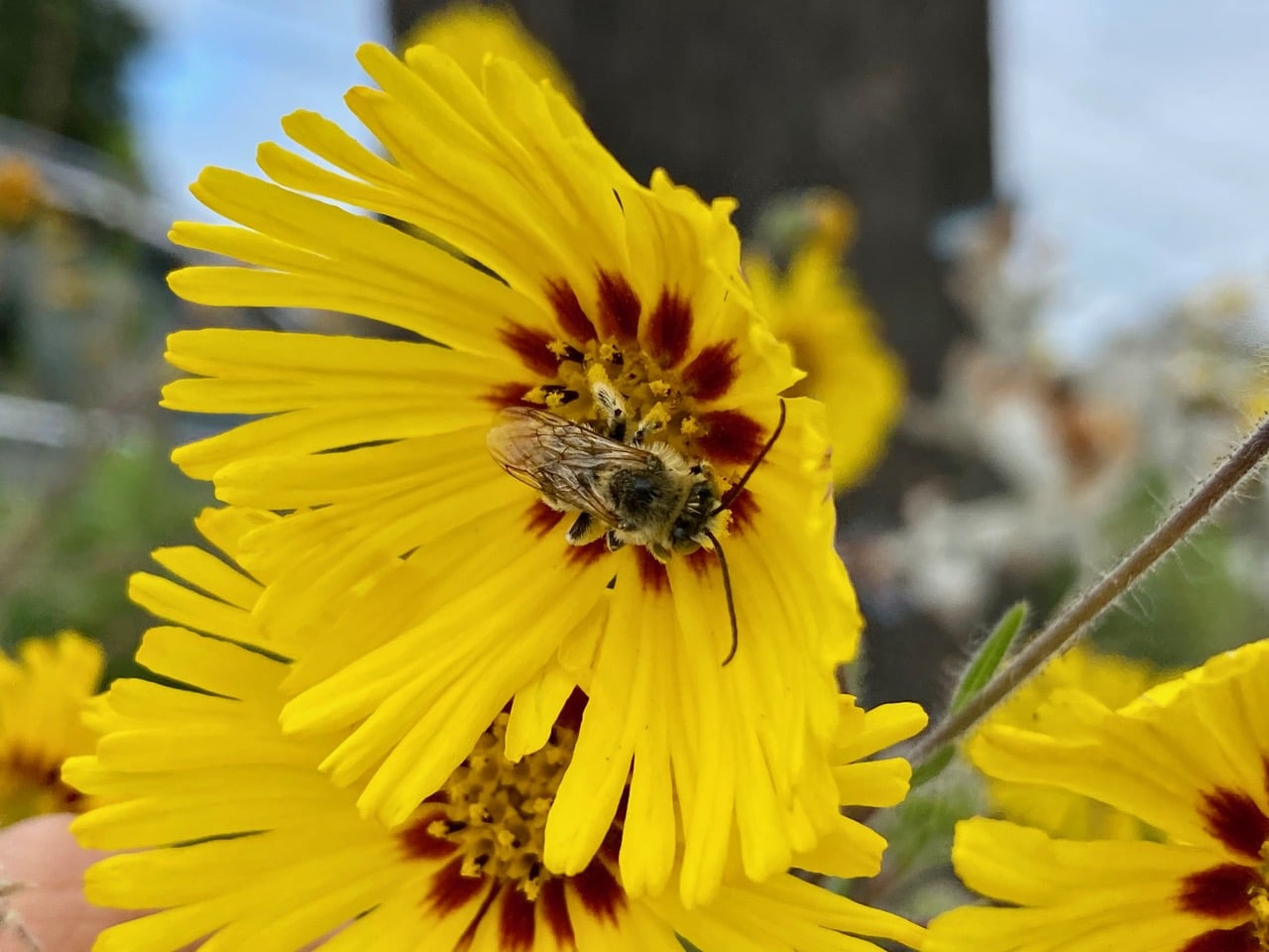 This male Longhorn Bee clings tightly to the tarweed flowerhead as it is blown about wildly by the wind. The very long antennae of the males give rise to the common name of “longhorn”.