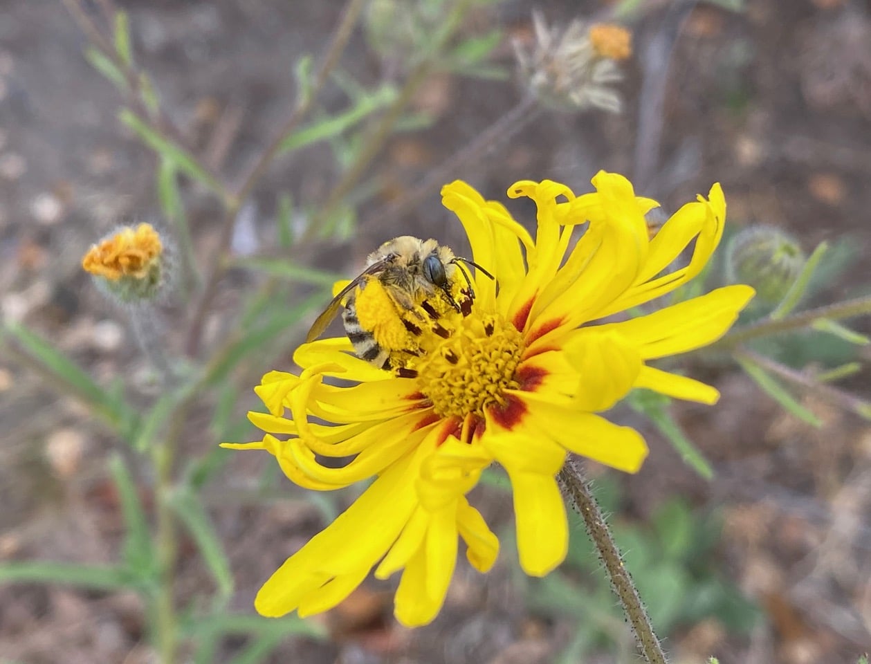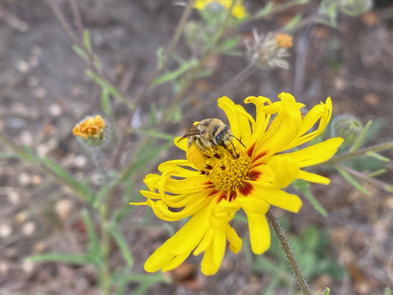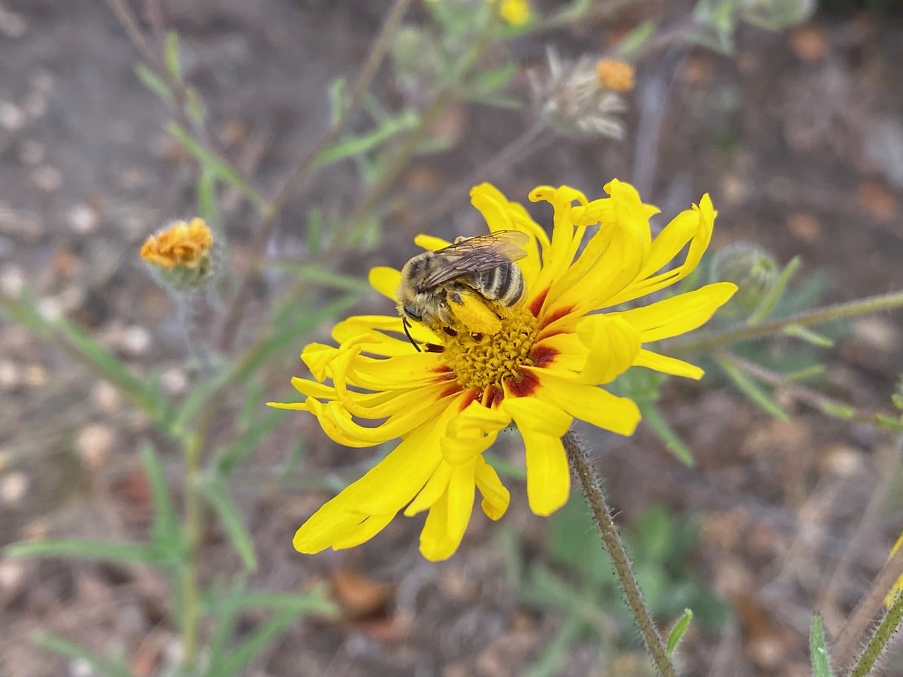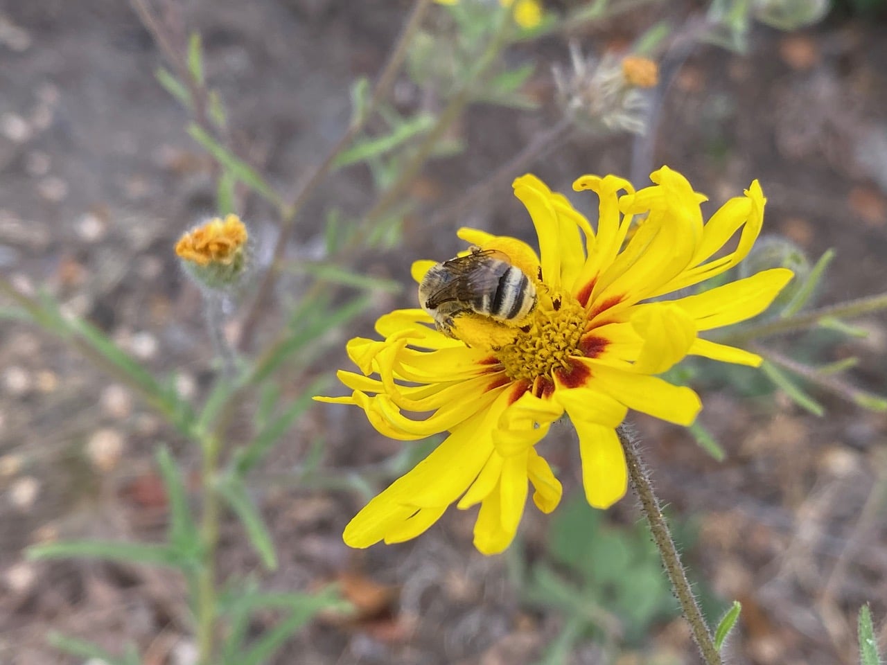 The Summer Longhorn Bees, Melissodes sp. (family Apidae) are medium to large bees, stout-bodied, usually with gray/brown hair on the thorax and pale hair bands on the abdomen. Males usually have yellow markings on their faces and have very long antennae from which their common name is derived. They are active May to September, with peak flight in late June to early August. The females prefer flat, bare ground for digging their solitary nests, though they sometimes nest in aggregations. Pollen is transported in scopae on the hind legs. Pollen loads are often copious and brightly colored and thus very distinguishable. Melissodes are specialists on Asteraceae – females gather pollen from flowers of Aster, Bidens, Coreopsis, Cosmos, Encelia, Gaillardia, Helianthus, and Rudbeckia ssp.
