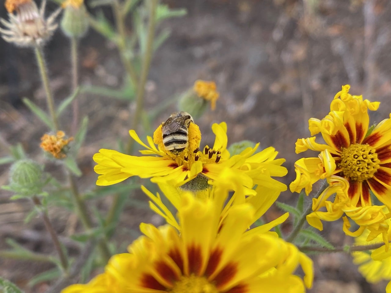Soon after the males leave their sleeping aggregation on the seed heads, they can be seen seeking nectar on the tarweed flowerheads.
