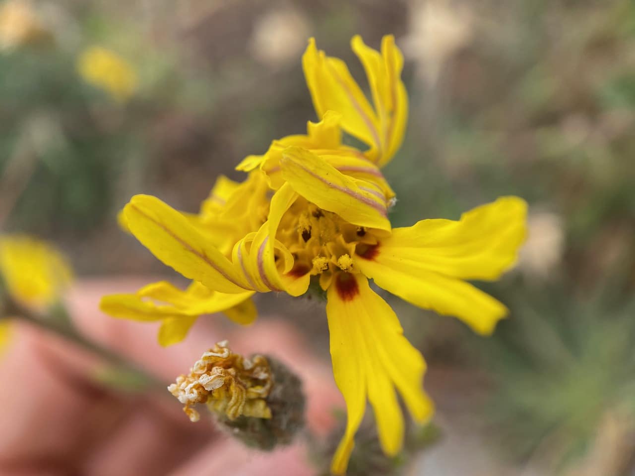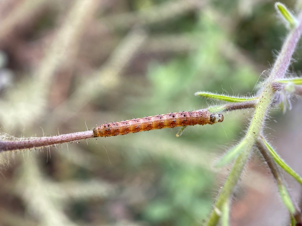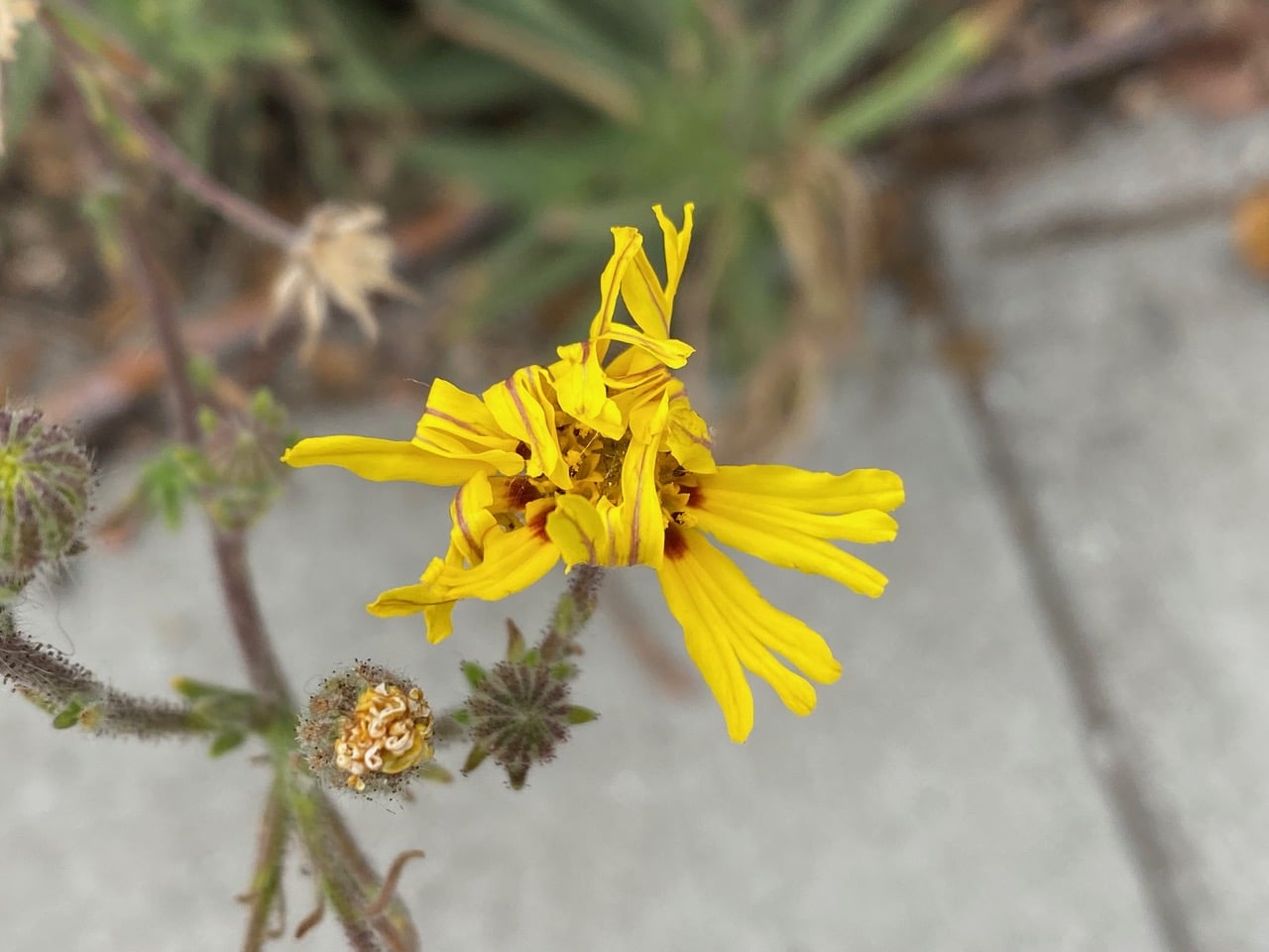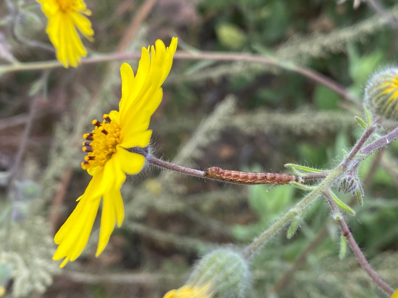 Most of the flowerheads of Elegant Tarweed are fully open on this cool, cloud morning. Someone has tempered with this one. I see traces of silk threads binding the ray petals together. I think I know who the culprit might be – a caterpillar of the Owlet Moth, Heliothodes diminutiva (family Noctuidae). The young caterpillars often bind together the ray petals to form an enclosed shelter in which the caterpillar can feed on the florets, safe from predators and parasitoids.
