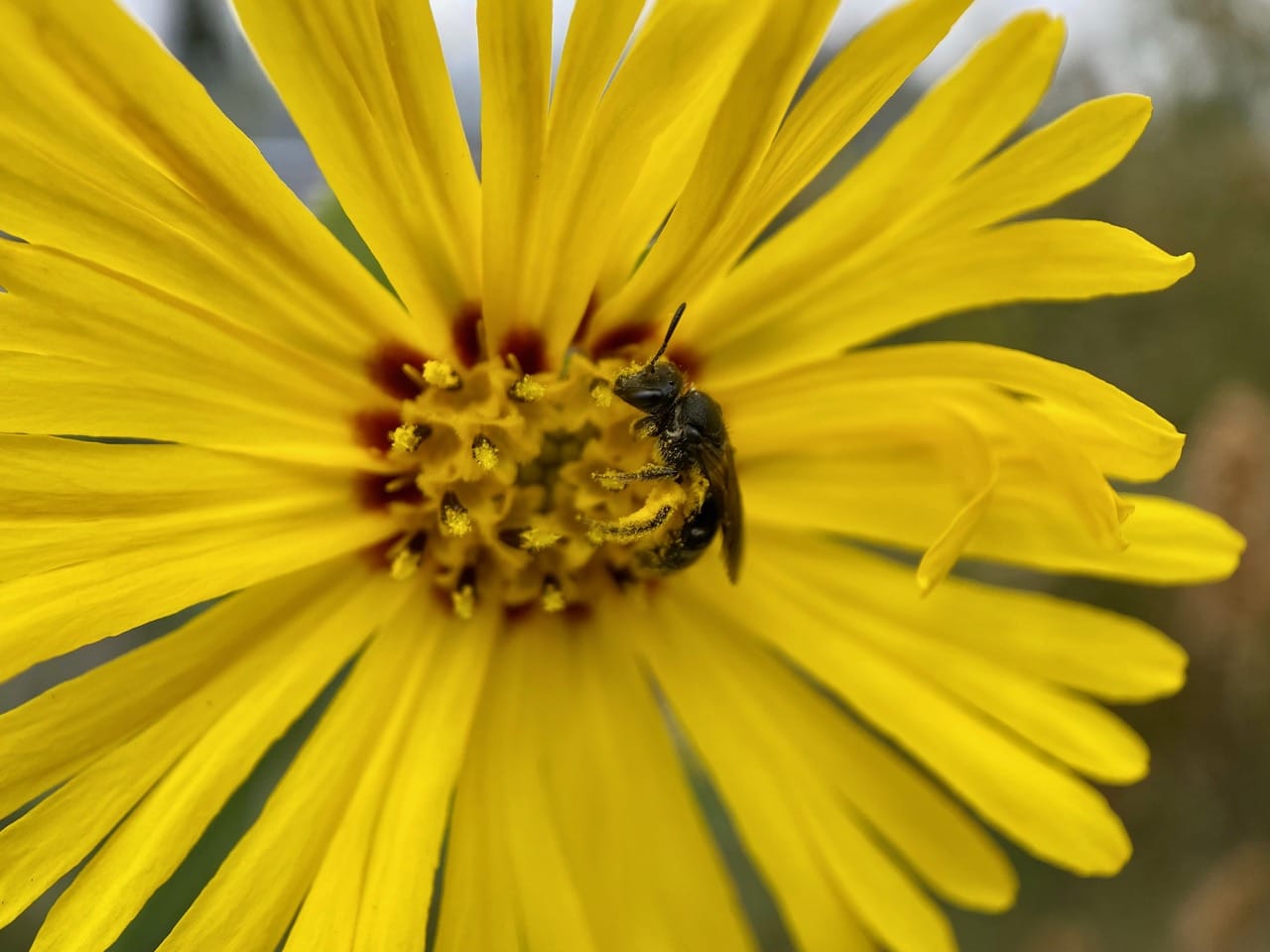 Minutes later, I find a female Kincaid’s Sweat Bee collecting pollen on another flowerhead. I wonder if the black coloration confers cold-tolerence to these bees? I often find them out foraging on cool mornings.
