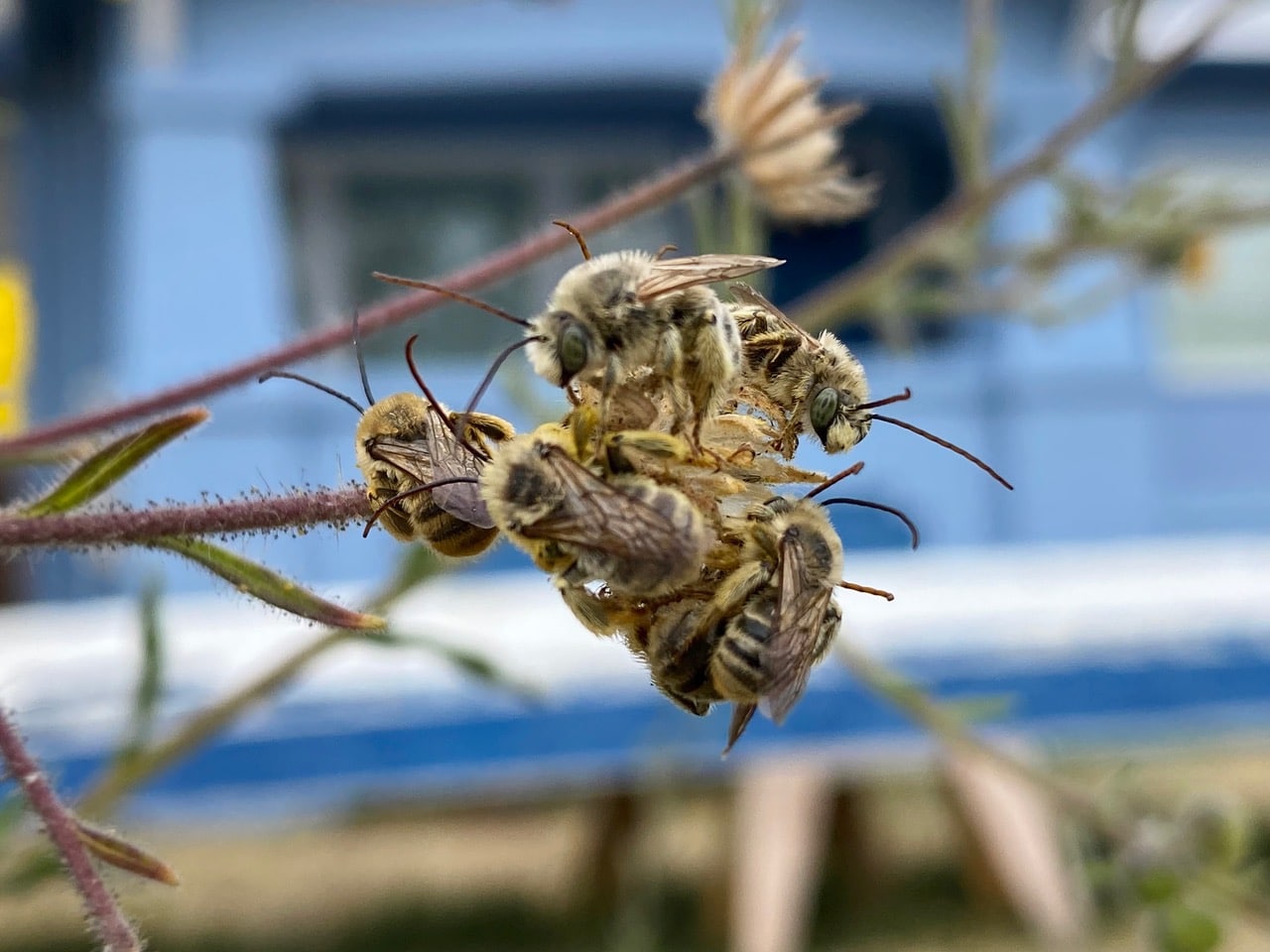 Since it is cool and cloudy this morning, I decide to make a quick run to Naomi’s sidewalk garden in Alameda. Maybe the male Summer Longhorn Bees, Melissodes sp. (family Apidae) are still sleeping in aggregation?