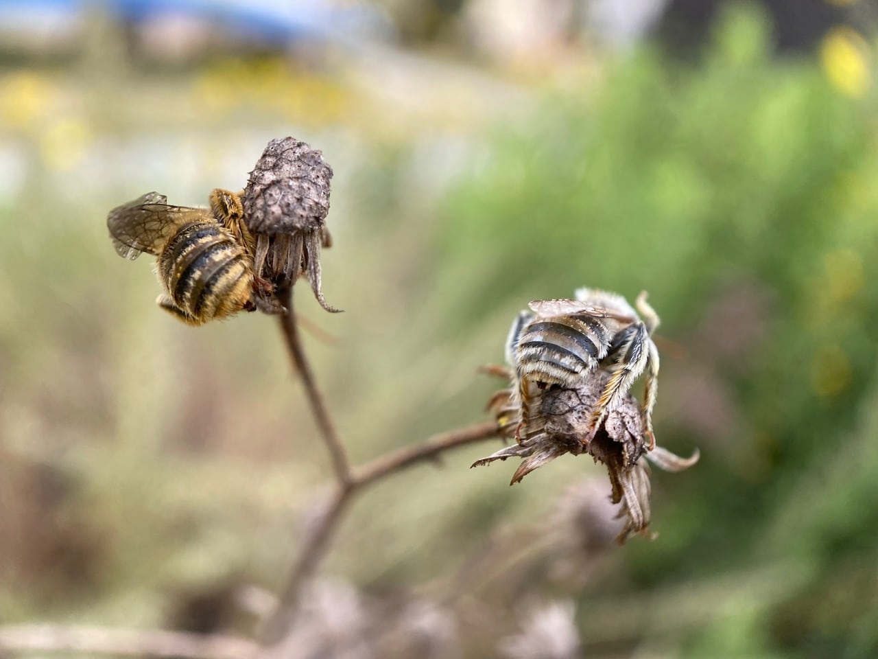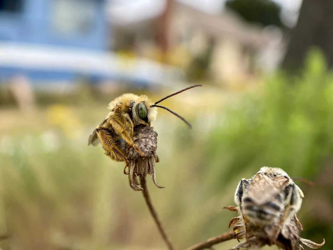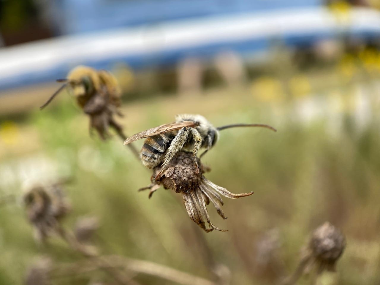 I located the old Telegraph Weed seed heads, Heterotheca grandiflora on which I have seen the males gather in the afternoon of 6/21/25. Only two males are sleeping on two adjacent seed heads here.
