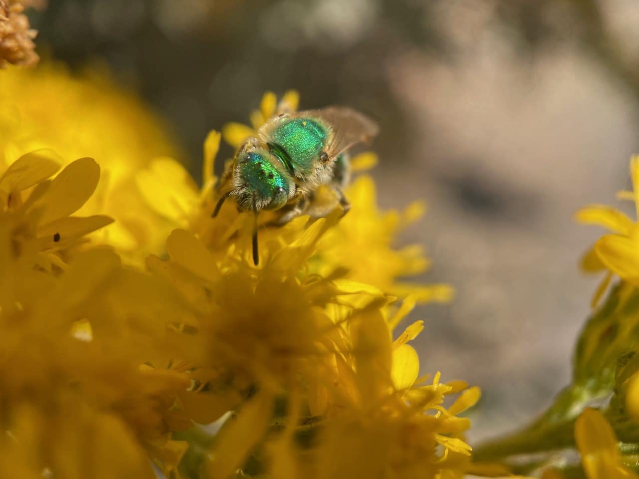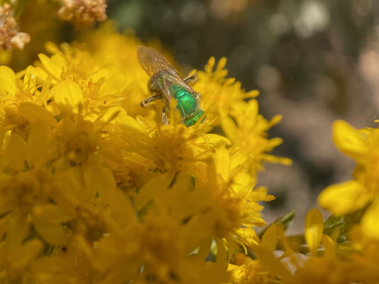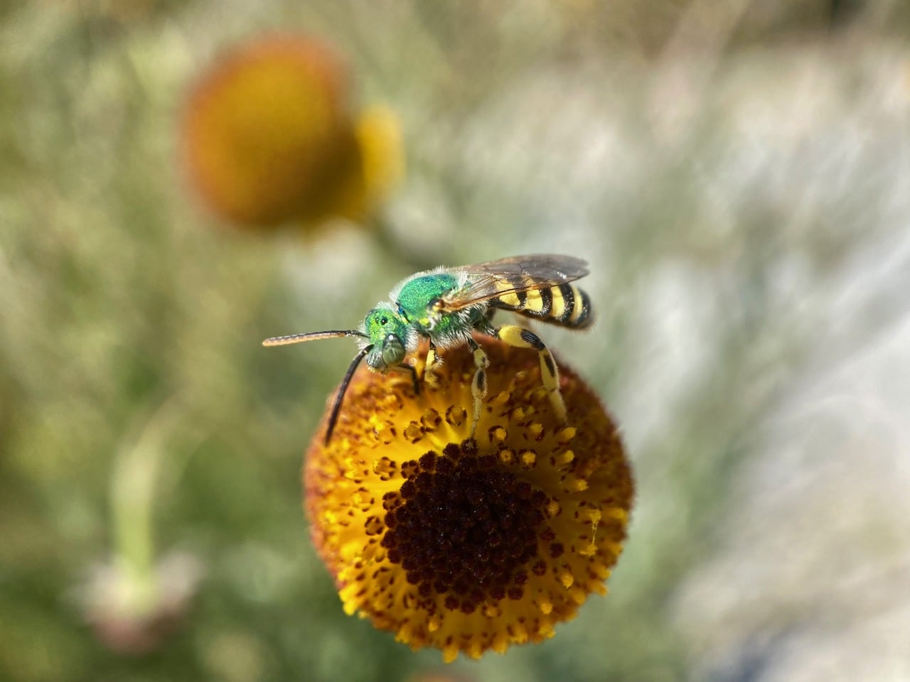 A female Fine Striped Sweat Bee, Agapostemon subtilior (family Halictidae) is foraging on a flowerhead of Sneezeweed, Helenium puberulum. Note that her body is entirely iridescent green. Note also the scopa (special pollen-collecting hairs) on her hind legs.