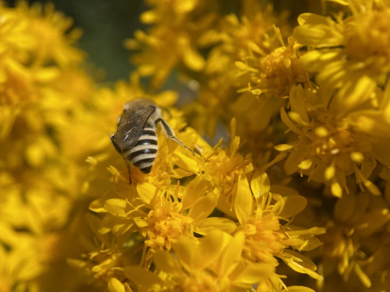 That’s the familiar rear end of a Cellophane Bee, Colletes sp. (family Colletidae). The little bee is foraging among the clusters of flowers of California Goldenrod, Solidago velutina ssp. californica.